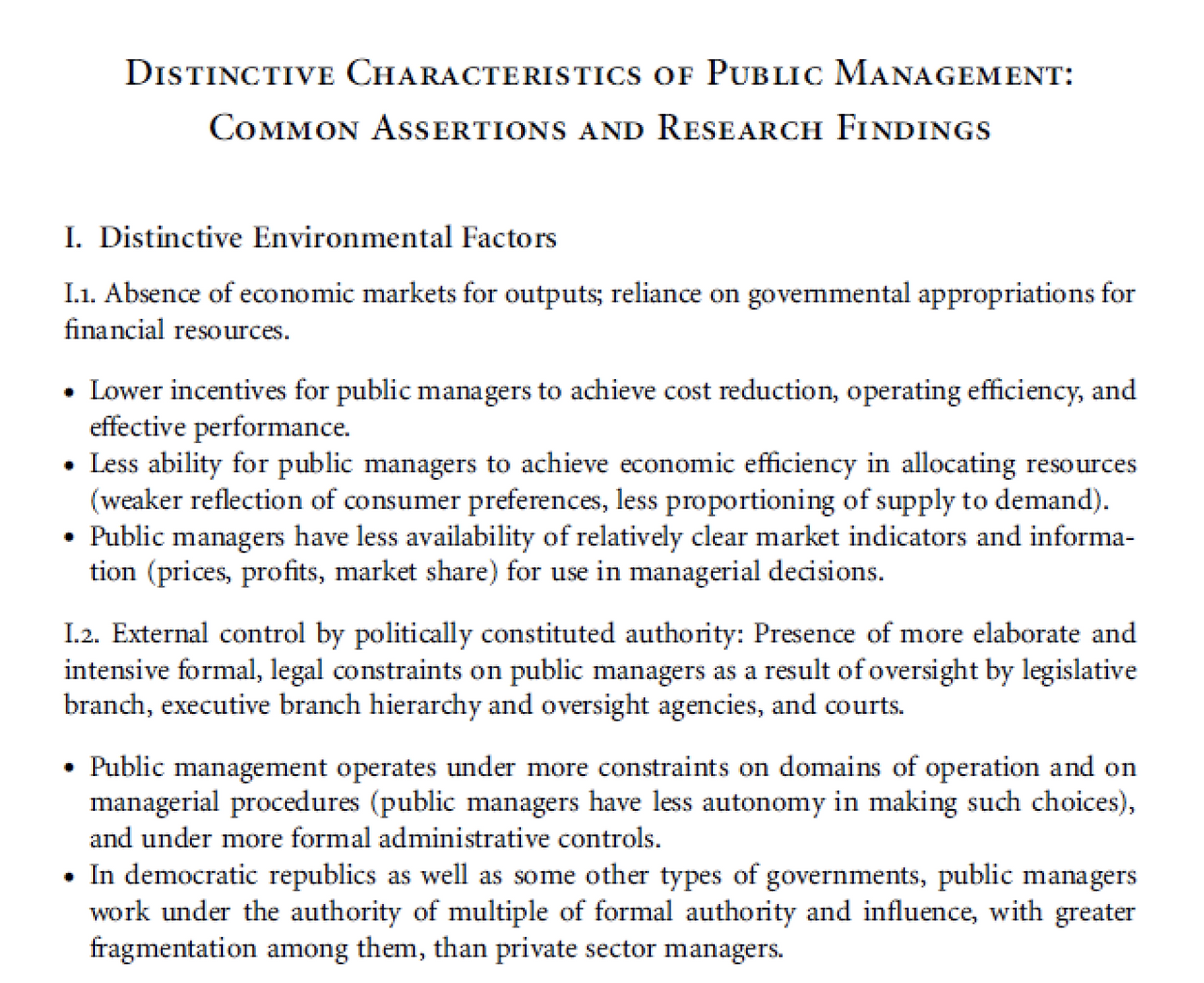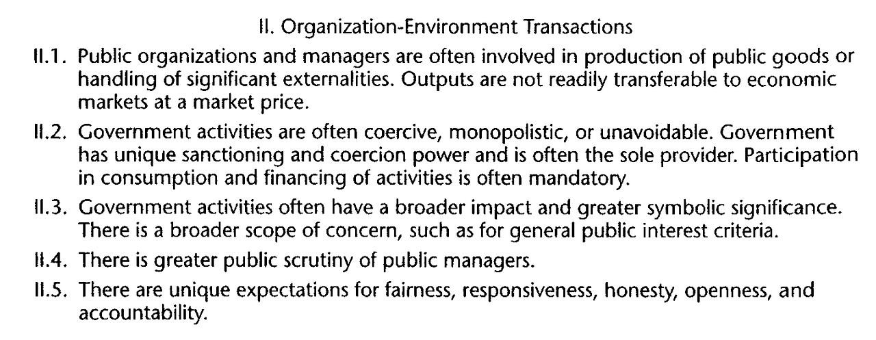 공공조직은 어떻게 다를까? 시장과 비교했을 때, 시장매커니즘이 작동하지 않을 때 효율성을 보면 공공조직과 공공관리의 문제를 제대로 볼 수 있다. 결론적으로 중요한 부분은 '정부환경의 외부적인 정치요소'이다. 외부환경에서 가장 영향을 많이 받는 부분은 바로 목표의 모호성인데, 이러한 모호한 원인은 한국정치와 함께 선거와 같은 정치 환경이다.
