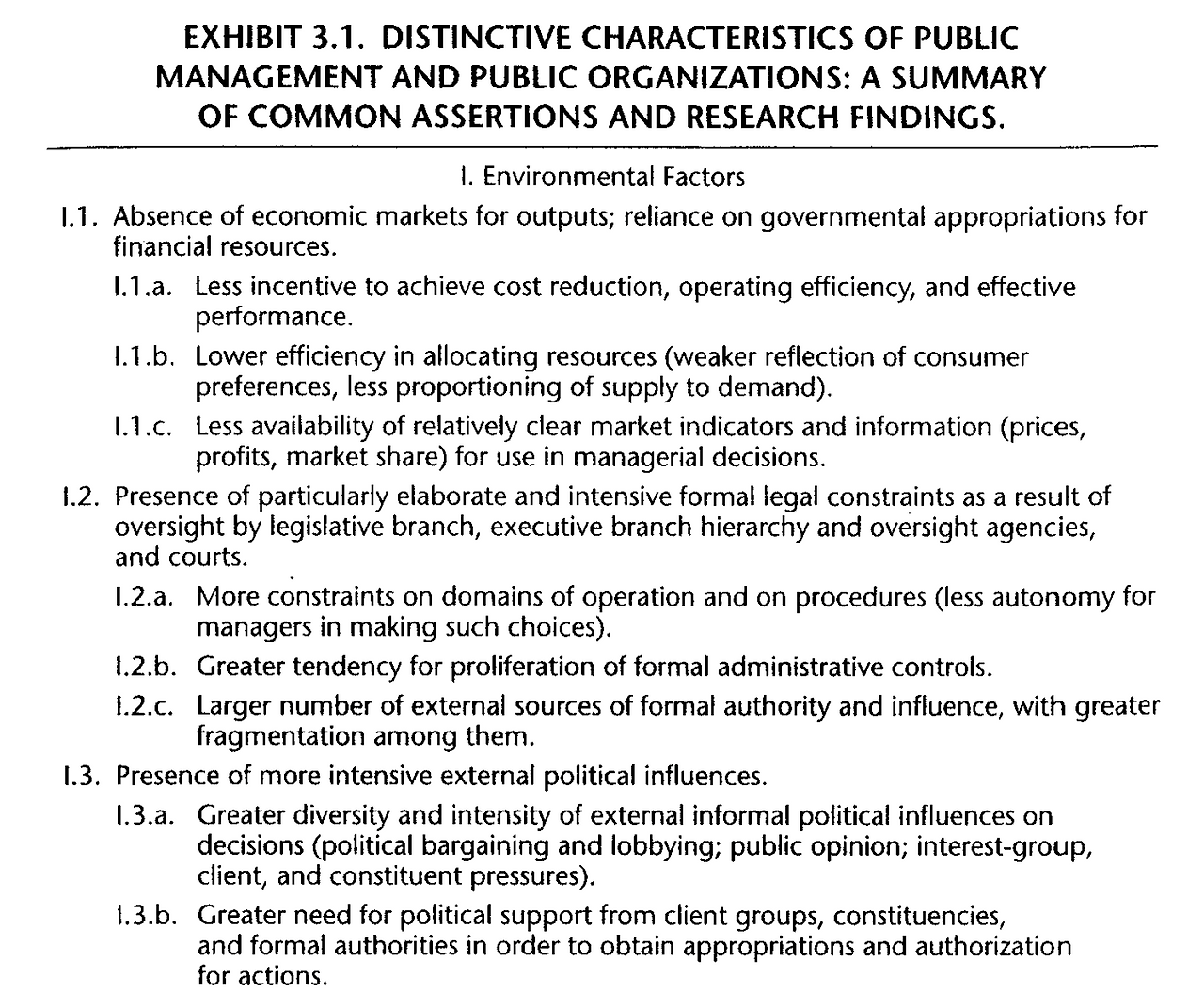 Absence of economic markets for output :시장과 다르게 경쟁이 없고, 효율성을 그렇게 고려하지 않아도 상관없는 환경이다. 정치적인 요소들이 기존의 관리적 역량보다 크게 작용하면서 목표가 모호해지고, 다양한 사람들이 시어머니가 되어서 잔소리를 하기 시작한다. 동기부여가 잘 안되고, 효율성이 떨어지며 유효한 지표나 정보가 부족하다.