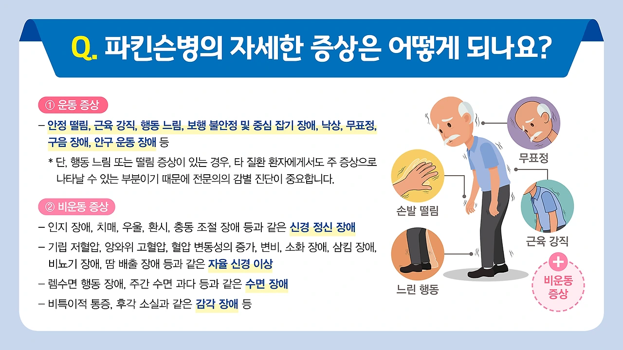 사람들과 함께 걷는데 다른 사람의 걸음걸이에 맞출 수 없어서 늦어거나 한 손으로 단추룰 못 꿴다면 파킨승병을 의심해볼 수 있다. 고령화사회가 진전되고 파킨슨병 환자는 1만명씩 늘어나지만 제대로 파킨슨병을 다룰 수 있는 정보들은 부족한 실정이다. 손을 떤다고 해서 '수전증'이 아니라 뇌의 활동의 이상으로 파킨슨병이 나타난다고 한다면 '진전'이라고 하는 떨림 현상을 주목해보아야 한다. 오늘은 질병노노와 함께 파킨슨병의 증상 중에서도 운동성 증상에 대해서 알아보고 간략하게 비운동성 증상에 대해서도 살펴보자.