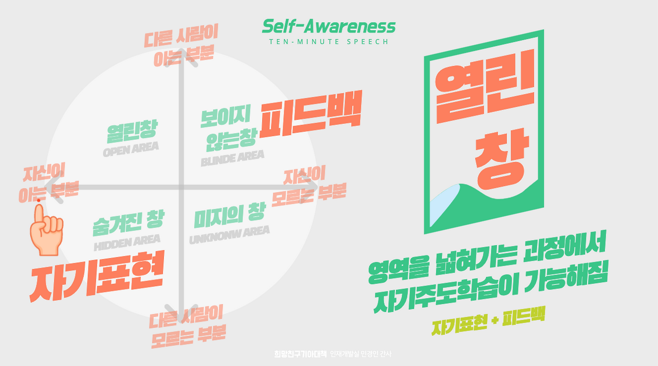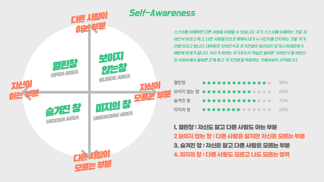 자신도 모르는 영역에서 남들이 알고 있는 영역도 있고, 남들은 알지만 내가 모르는 부분도 존재한다. 특히 잠재력은 다른 사람과 내가 모두 모르는 부분일 수도 있다.