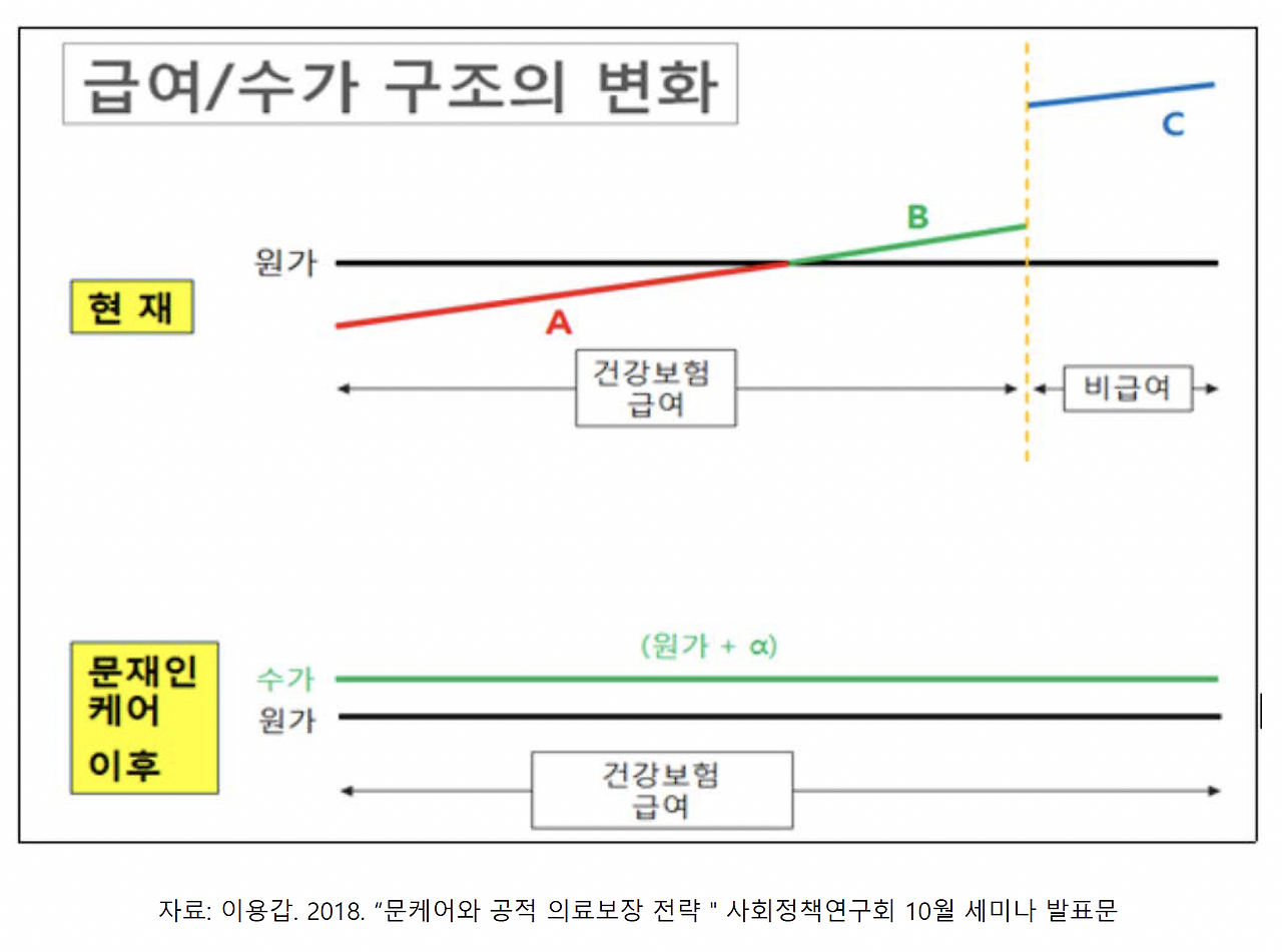 급여항목에 대해서만 국가가 제공하고 이에 따른 제한이나 기준이 있기 때문에, 숫가에서도 비급여항목의 행위가 늘어나게 되면서 개인부담이 커지게 된다.