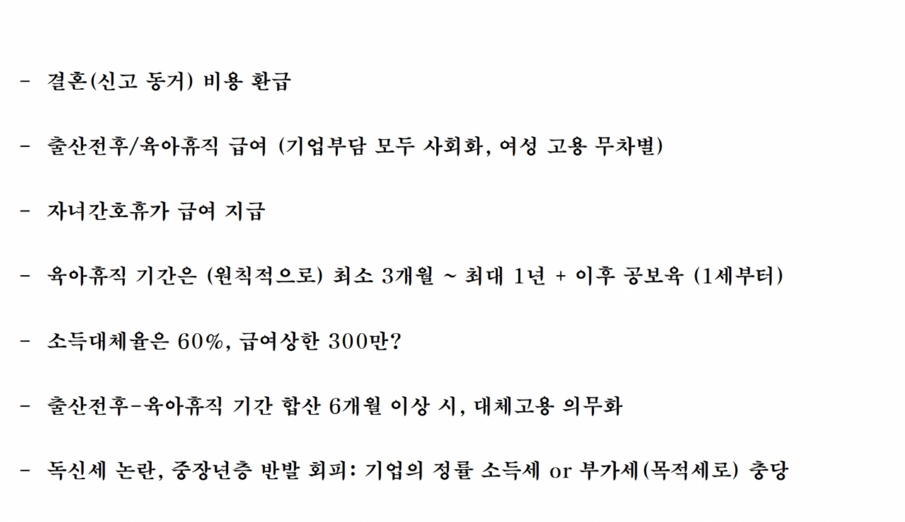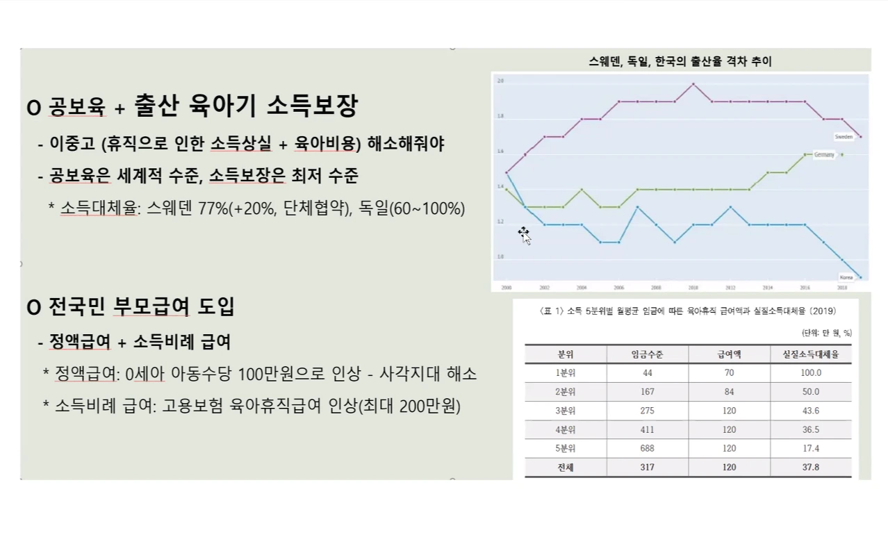 공보육 + 출산육아기 소득 보장 : 이중고(휴직으로 인한 소득상실 + 육아비용)해소해줘야 한다. 공보육은 세계적 수준, 소득보장은 최저수준 (소득대체율이 스웨덴 77%(+20%, 단체협약), 독일(6-~100%) 로 한다.