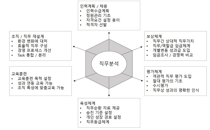 직무분석은 일을 수행하는 사람들이 자신이 해야할 일의 규모와 범위, 달성해야할 책임이 무엇인지를 파악하고 그것을 핵심성과와 연결시키기 위한 일련의 과정들을 말한다. 따라서 기본적으로 일에 대한 구분이 MECE하게 되어 있으며 그에 맞는 역할, 요구하는 수준, 정도, 범위가 확실하게 되어 있다면 비로소 '적재적소'라는 말을 쓸 수 있다. 적재적소에 이러한 직무를 수행할 수 있는 사람을 뽑는 것이 바로 인재관리의 핵심이다. 그런데 이것이 HRD영역에서도 다루어진다는 것은 이미 만들어진 인재가 있다는 개념보다는 인재들을 선발해서 부족한 역량을 개발해주고 앞으로 할 수 있도록 학습과 경험을 제공하는 일을 HRD에서 해야한다는 말이다.