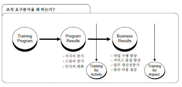 교육요구분석은 HRD프로세스로 부터 문제해결을 위한 솔루션이 교육으로 한정될 때만 진행한다. 이를 명확하게 하기 우해서 요구분석과 요구사정을 구분해야 한다.