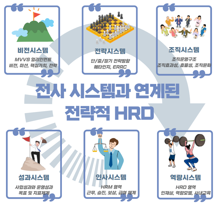 HRD는 기본적으로 시스템을 가진 조직에서 이루어진다. HRD의 주된 목적은 문제해결이다. 문제해결을 위해서 성과개발, 역량개발을 해 나간다. 시스템은 구조와 행위로 이루어져 있다. 구조는 요소elements와 요소들 간의 관계relationship으로 이루어지고 구조가 영향을 미쳐서 시스템 안에서 행위가 결정되다. 행위는 사건events과 패턴pattern으로 이루어져 있다. 요소들 간의 관계가 구조를 이루고 이 구조의 이해서 개별적인 사건이 패턴을 이루면서 일어나는 것이 시스템이다. 모든 시스템은 살아 있고 그 자체로 움직이면서 다른 시스템과 연결된다. 시스템끼리 같은 방향을 추구하면서 연동될 때 시너지라고 부르며, 시너지는 시스템과 에너지의 약자이다. HRD는 구조 안에 개별행위자인 요소들의 역량이 개발되어서 성과를 내는 관계로 연결되도록 유도하며 이를 통해서 시스템에 다가온 문제를 해결하도록 돕는다.