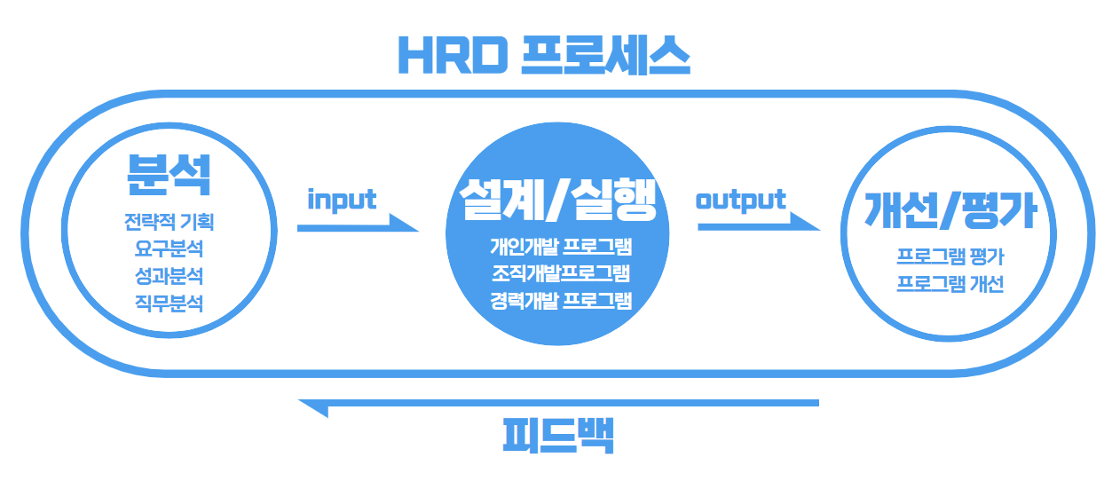 시스템은 그 자체로 유지된다. 시스템이 현실에서 어떻게 운영되고 돌아가는지를 살펴보는 작업은 '프로세스'설계를 어떻게 하는가의 문제이다. HRD 시스템 프로세스는 보통 4가지의 단계로 구성된다. input에 해당하는 상황분석을 통해서 전략적 기획과 요구분석, 성과분석, 직무분석을 진행한다. HRD 프로세스를 시스템화하기 위해서는 진행하는 단계에서 데이터 축적은 필수가 된다. 이렇게 축적한 데이터를 분석하여 두번째 단계인 프로그램 설계와 실행을 진행한다. 프로그램은 HRD의 큰 분류인 개인개발/조직개발/경력개발 차원에서 진행한다.