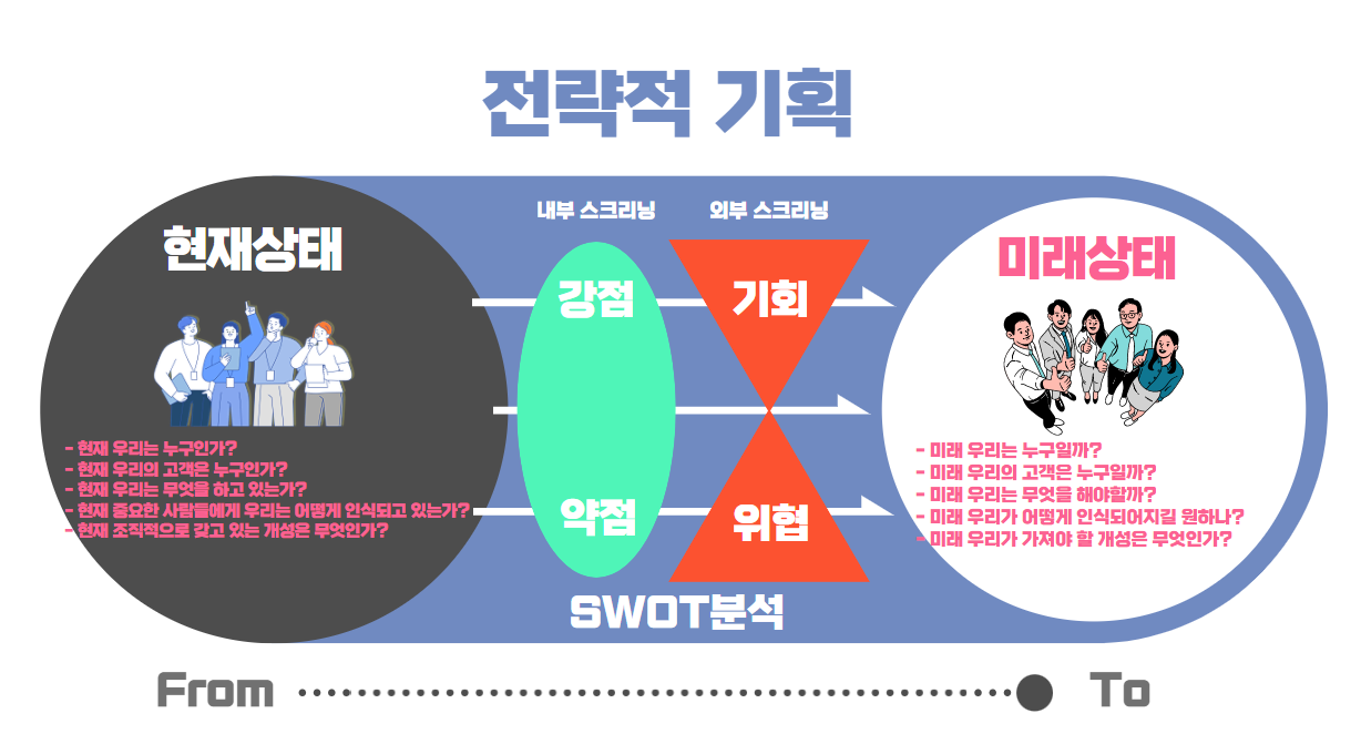 전략적 기획은 경영차원에서 앞으로 우리 조직이 어디에 있고, 앞으로 어떤 방향으로 갈 것인지를 기획하는 것이다. 전략적 기획을 위해서는 현재상태와 미래상태에 대한 진단이 필요하며, HRD의 부서 특성상 전사 전략을 만들수는 없지만 전략적 HRD를 통해서 능동적으로 HRD 프로그램을 운영할 수 있다. 전략적 기획은 요구분석, 성과분석, 직무분석을 바탕으로 중요도와 우선순위를 설정하고 그에 필요한 개발을 진행하는 프로스세를 설계하는 것을 말한다. 현재상태에서 강점과 약점을 분석한뒤, 미래 상태로 가는 길에서 발생할 수 있는 위협과 기회를 포착하여 미래상태를 만들기 위한 HRD를 기획한다.