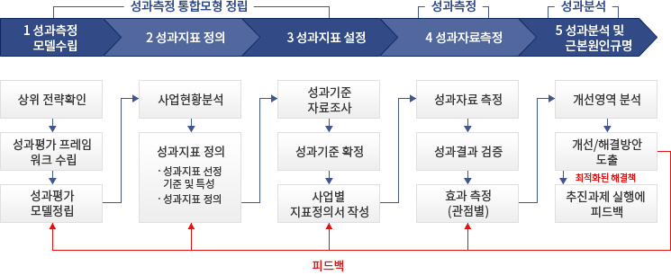 지표의 구분은 프로그램의 성격에 따라서 정성적, 정량적으로 구분된다. 이러한 평가의 과정을 거쳐서 피드백을 통한 개선으로 이루어지는 순환구조를 가지게 된다.