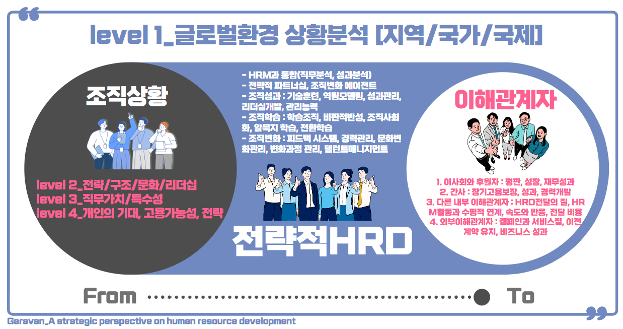 HRD의 시작은 상황분석이다. 전략단위에서는 글러벌 환경, 국내외 시장조사 및 환경분석이 이루어지지만 HRD에서는 그거한 분석을 이미 '전략설계'에서 진행한 것으로 가정하고 전략과 연결한 '전략적 기획'을 실행한다.