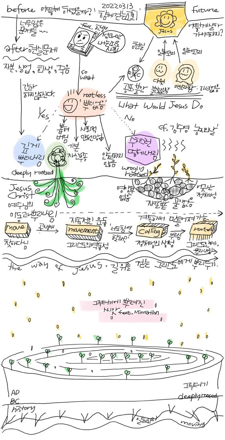 예수님은 구약성경에 다윗과 아브라함과 같은 인물들을 통해서 비유로 예견되어있었다. 일명 알래고리라고 부르는 것들이다. 예수님은 근데 왜 그런 고통을 그렇게 당해야했었나? 여기서 시몬베이유의 이야기를 가지고 온다. 시몬베이유는 현대를 사는 우리들이 불안하고 불행한 이유는 뿌리를 뽑혀서라고 말한다. 안전한 장소, 공유할 수 있는 공동체, 삶의 깊이를 만들어낼 수 있는 여유가 없는 이유는 바로 깊게 뿌리내리지 못해서이다. 그 불안은 알랭드보통도 이야기한다. 비교하지 않으면 불행은 시작되지 않는다. 그런데 계속해서 뿌리가 뽑혀서 노마드가 되는 인생은 항상 비교와 불안은 안고 사는 삶이다. 그래서 사람들은 가끔, 아니 자주 돌짝에 뿌리를 내렸다가 비가 올며 쓸려가 버린다. 잘못된 뿌리내림이다.