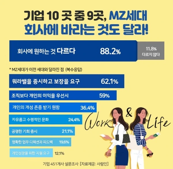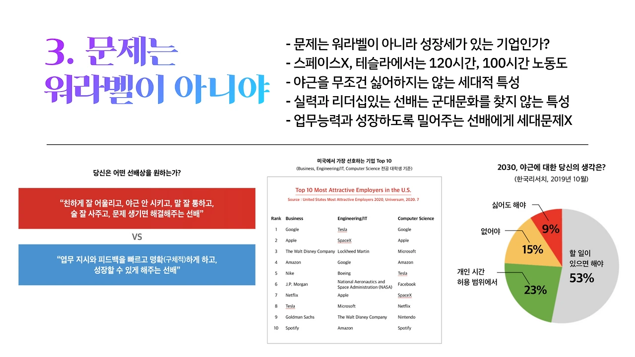 - 애사심은 돈에서 나온다. 1990년대 중반 병장월급은 1만원이었고 2020년 병장 월급은 54만원이다. 이전 세대는 애사심은 관계나 조직에서 나온다고 하지만, MZ세대는 공정한 돈이 중요하다.