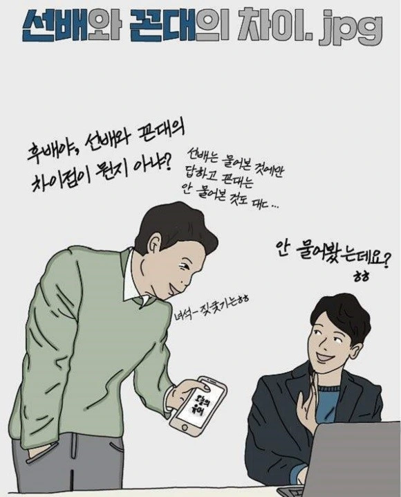 - 예전에 아르바이트를 할 때 사장님에 대해서 '꼰대'야 하는 것이 완전히 이해된다. 꼰대는 팍 보이기도 한다.