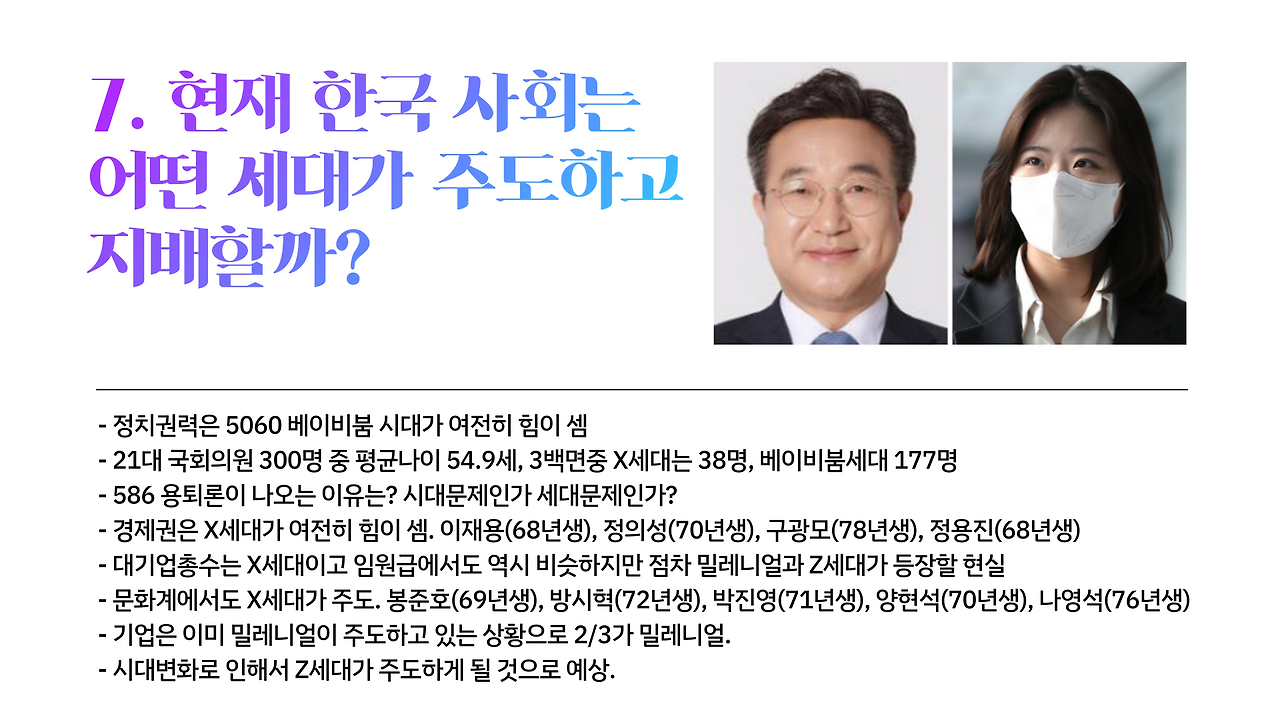 다음과 같이 발제를 줌으로 녹화했다. 이번 시간을 통해서 MZ세대를 이해하고 세대프레임을 시대전환 프레임으로 가져올 수 있는 방법을 고민해 보았다. 부디 새로운 시대를 열어낼 세대들이 일어날길 기대한다.