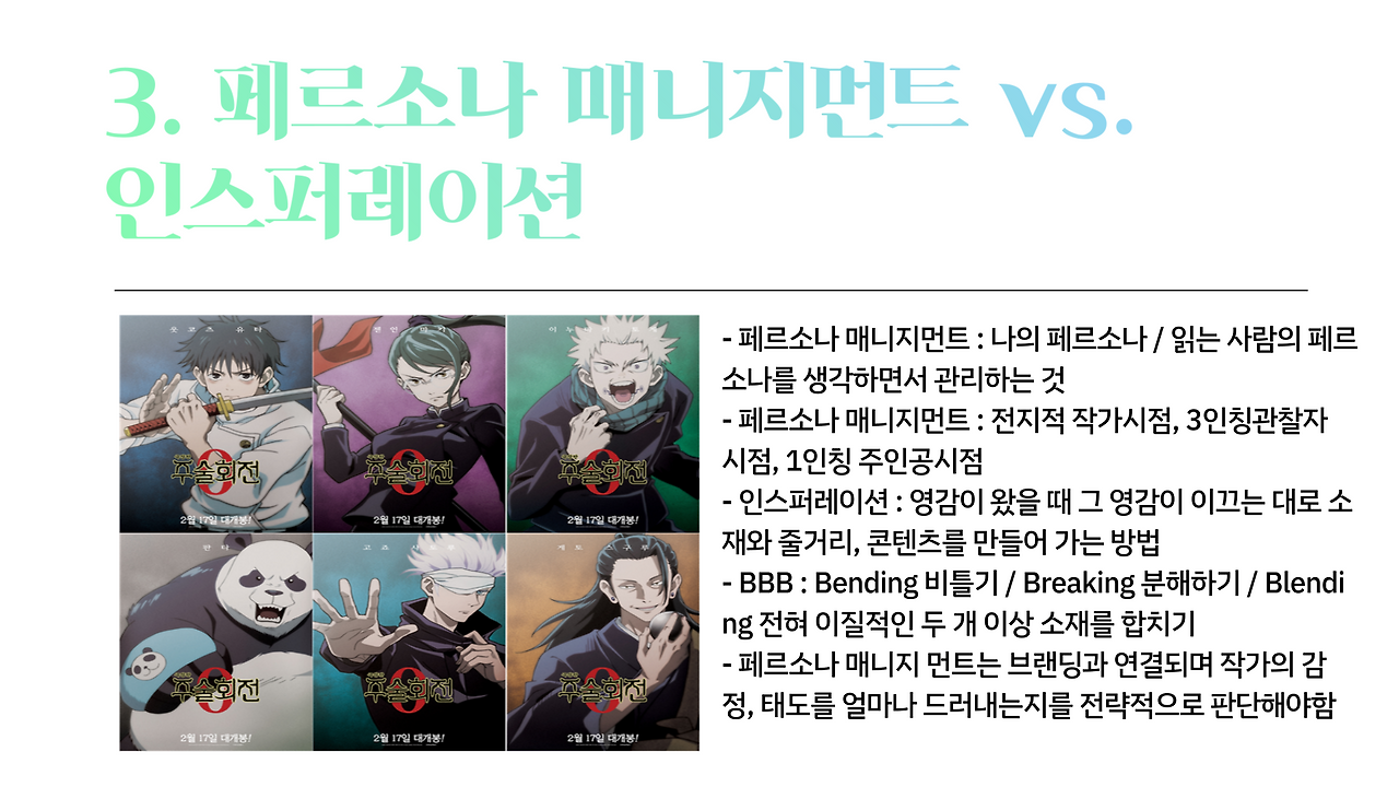 반대로 영감이 아니라 전략과 세세한 묘사, 오랜시간의 관찰을 통해서 인물과 사건을 만들고 배경을 구성해내는 작가들이 있다. 이른바 극중 인물인 '페르소나'를 관리해서 발전시키는 방식이다. 이러한 페르소나 매니지 먼트는 하나의 깨달음으로 인물이 만들어지고 소재를 전개하는 게 아니라 다양한 출처들을 모으고 관찰해서 만들어진다. 그러다 보니 페르소나 매니지먼트를 통해서 태어난 글은 조금씩 조금씩 독자들에게 스며들고 여러가지 복선들이 후반부의 클라이막스에서 터지기도 한다. 물론 지루한 감이 있을 수도 있지만 반대로 지루하지 않게 재미의 요소를 중간중간 안매할 수도 있다.
