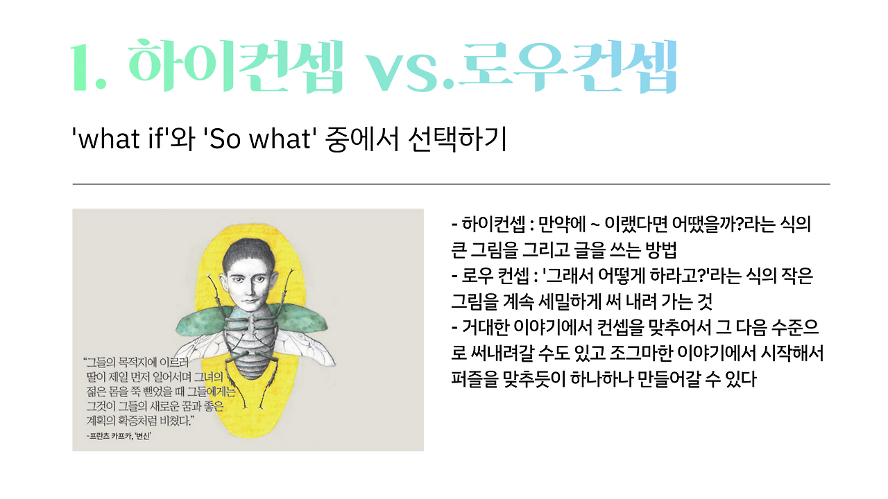 어느날 그레고리 잠자라는 주인공은 잠에서 깨어났지만 자신이 '작은 벌레'가 되어 있었다. 변신한 잠자는 벌레의 관점에서 세상을 살아가게 되는데 이 이야기를 써 보는 것이 카프카의 '변신'이다. '인간은 환생해서 지금 인간이 되었지만 죄를 지으면 벌레가 됩니다'라고 하는 말을 할 필요도 없이, 벌레가 되어 버린 주인공의 이야기를 하다보면 사람들의 상상력은 '정말 그럴수도 있겠다'가 된다. 사실 요즘에 재미있다?라는 느낌이 드는 글이나 영화나 시나리오는 대부분 하이컨셉이 많다.