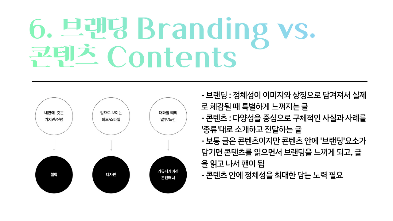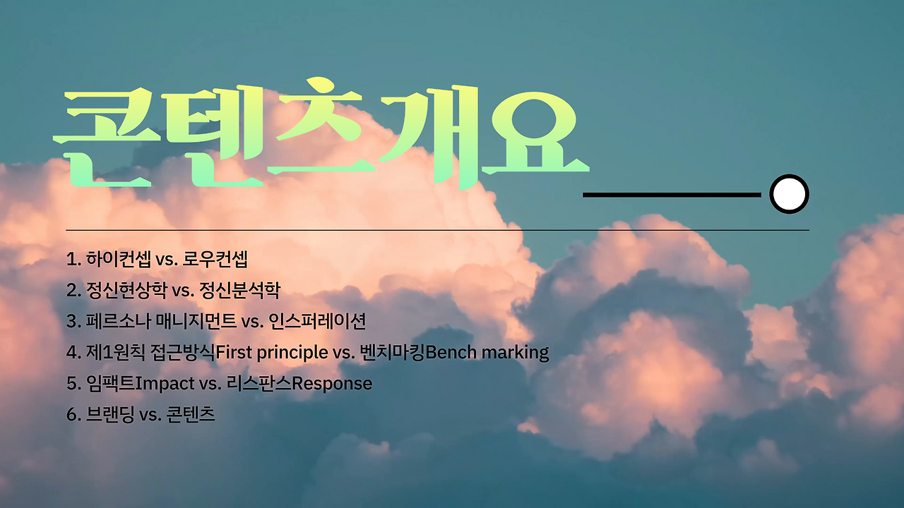 컨셉이란 글의 전체의 방향을 설정하는 것을 말한다. 그러니깐 컨셉에는 방향성과 미래, 그에 대한 나의 태도와 어조, 단어의 선택과 문장의 길이와 흐름이 정해지는 것이다. '밝은 느낌'의 컨셉도 있고 '신선한 컨셉, 희망찬 컨셉'과 같은 단순한 컨셉도 있지만 글을 쓸때는 크게 2가지의 컨셉이 존재한다. 하얀 도화지에 새로운 그림을 그린다고 생각해보자 그러면 두 가지의 방향이 생긴다. 큰 그림을 먼저 그리고 작은 부분을 세밀하게 채워가는 방향과 작은 부분부터 시작해서 큰 그림으로 발전하는 것이다. 글을 쓸 때도 하이컨셉과 로우컨셉이 있다. 먼저 큰 그림을 그리고 시작하는 하이컨셉과 작은그림부터 빌드업해가는 로우컨셉은 글쓰기에는 보통 두괄식이나 미괄식이다 혹은 연역적이다 귀납적이다라고 불린다.