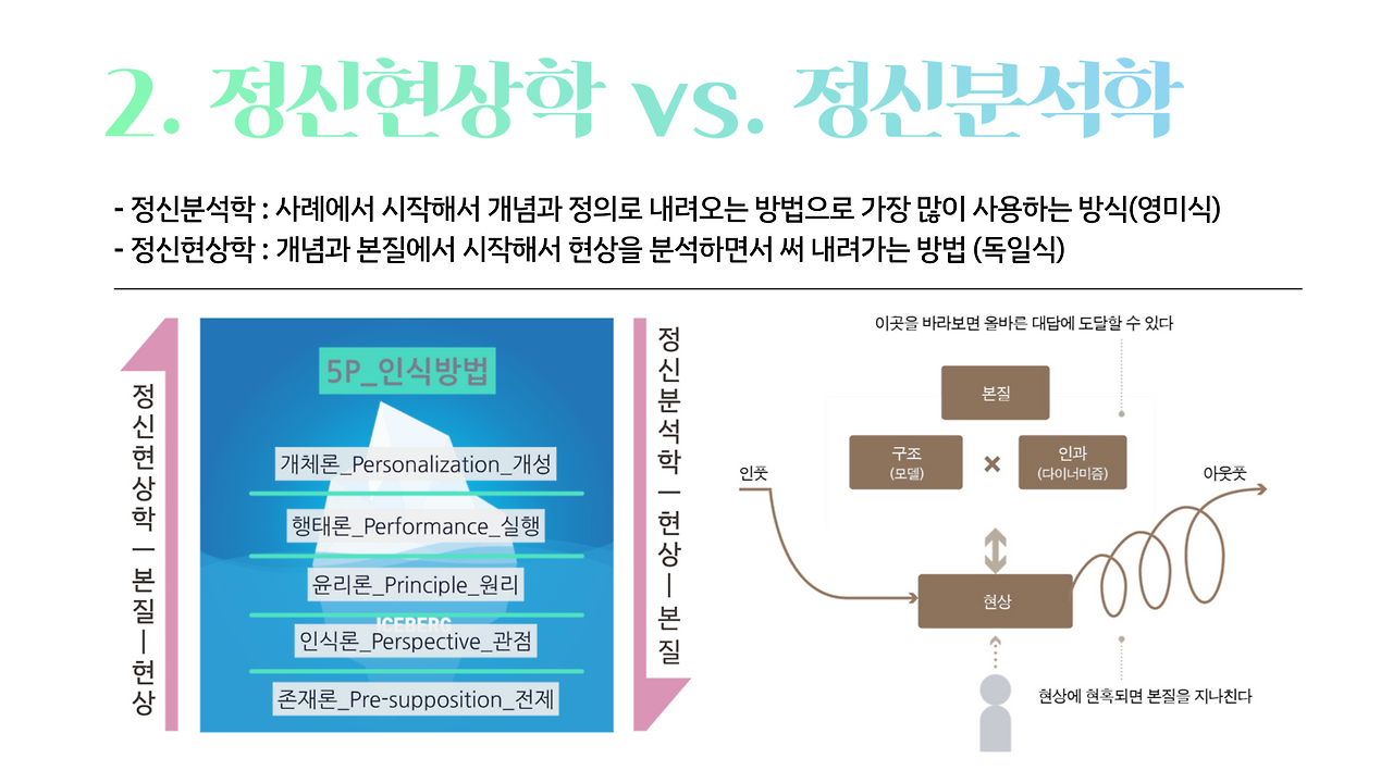 컨셉을 정했다면 이제 세부적인 방향을 정해야 한다. 보통 메타인지라고 할 때 가장 많이 사용하는 도표이긴 한데 글을 쓸 때도 이런 부분을 사용해 볼 수 있다. 인간이 생각하는 방향은 크게 2가지로 구분해볼 수 있다. 한가지는 현상에서 본질인 정신으로 들어가는 정신분석학과 정신의 근원에서 펼쳐져서 나와서 현상으로 나오는 정신현상학이 그것이다. 정신현상학적 방법은 글을 쓸 때는 개념이나 정의에서 시작해서 구성요소와 운영원리 그리고 실제 현실에서는 어떻게 운영되는지를 설명하는 방식으로 전개가 된다. 그래서 이것은 '무엇~이라고 부른다'라고 정리를 내린다. 반대로 분석학은 현상에서 시작한다. 따라서 '이것이 있다, 그런데 이것이 움직일 때는 이런 움직임을 보이는데 이런 움직임은 어떤 원리가 있다'라는 식으로 흐름이 생긴다.