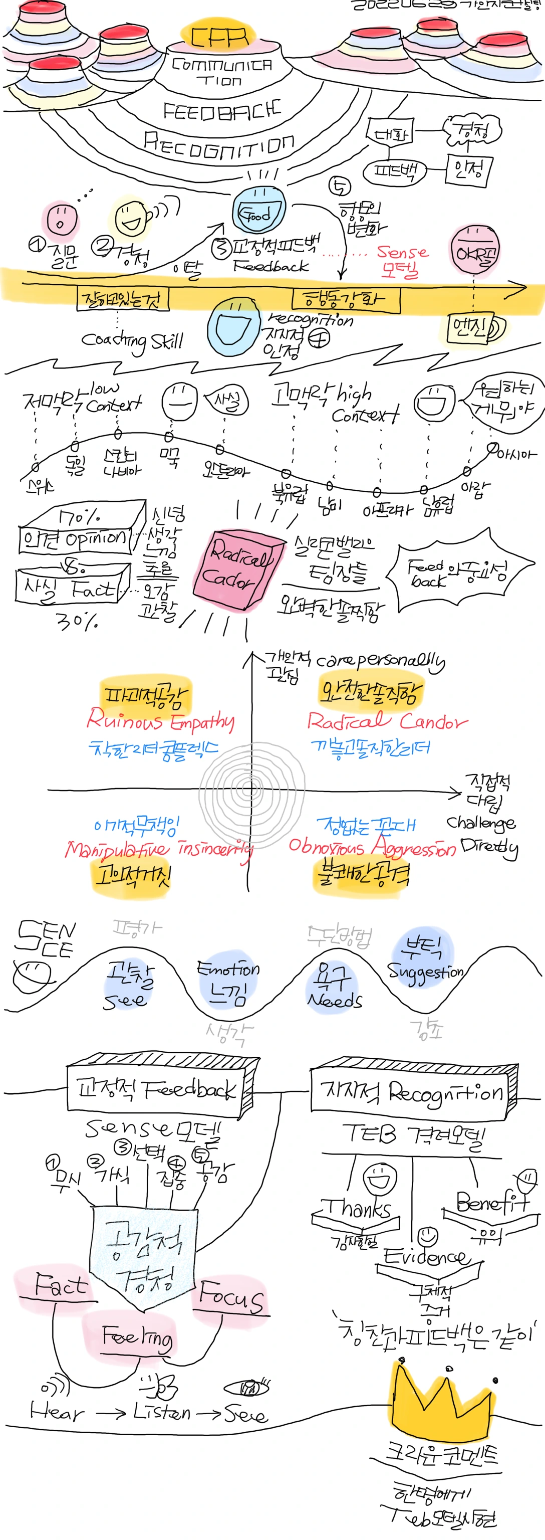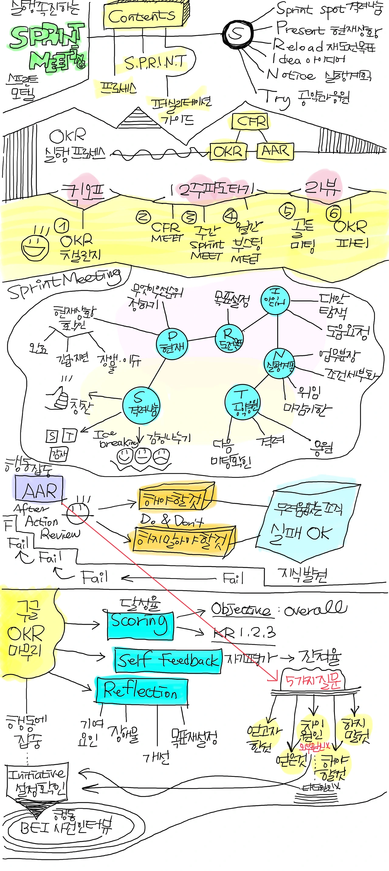오늘은 지난시간에 이어서 CFR이라는 평상시의 대화와 피드백 방식과 회의방식으로 SPRINT방법론을 배웠다. 이미 퍼실리테이션을 통해서 알고 있기는 했지만 나름대로 OKR과 연동되는 툴이라는 생각이 들었다. 사람들은 누구나 새로운 것을 도전하고 싶고, 진부한 것을 피하고 싶어한다. 다만 장애물이 있거나 리스크가 있다면 피하고 싶을 뿐이다. 그러니 인간이 원래 가지고 있는 긍정적인 에너지를 모아서 문제를 해결하고 변화를 만들어가면 좋겠다. 다시 시작이다!