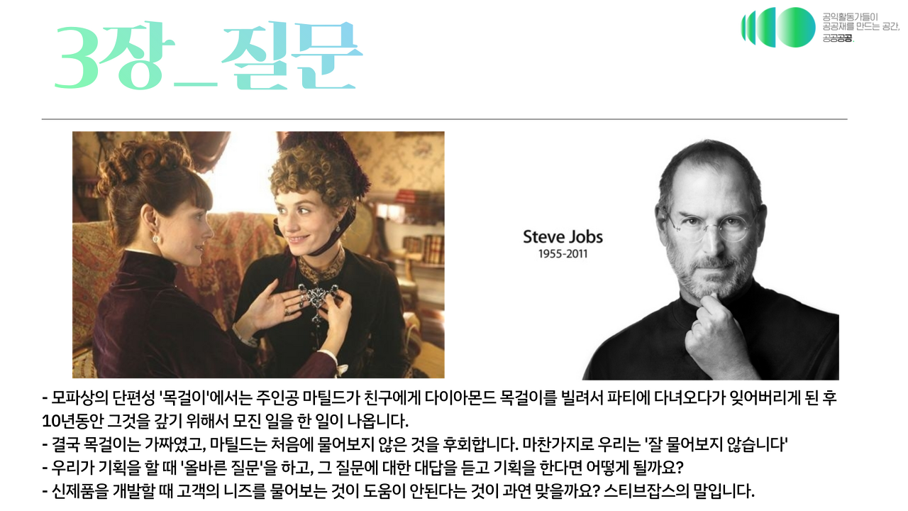 근데 아쉬운 점은 이 책이 상품을 기획하는, 신제품을 만드는 프로세스로 정리되어 있다 보니까 상품이 아닌 활동, 운동 차원의 것으로 전환하는 게 어렵더라고요. 그래서 후속 모임에서 같이 공부한 내용을 적용해서 매뉴얼이나 툴킷 만들어보자고 이야기 나누기도 했죠. 물론 한 번에 만들어지지도 않을거고 시간도 걸리겠지만요.