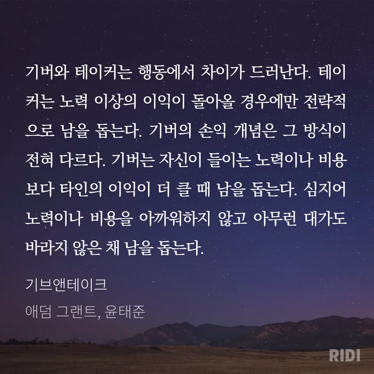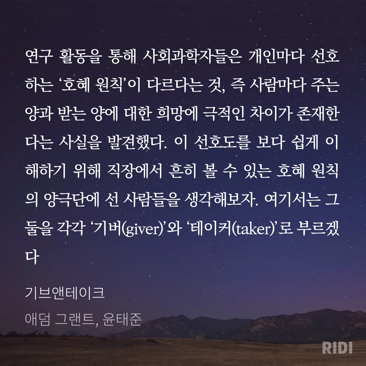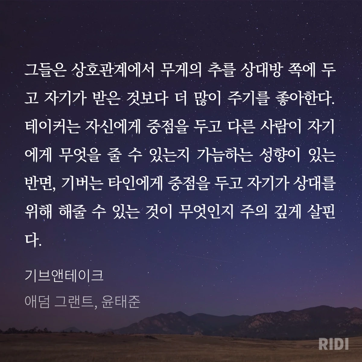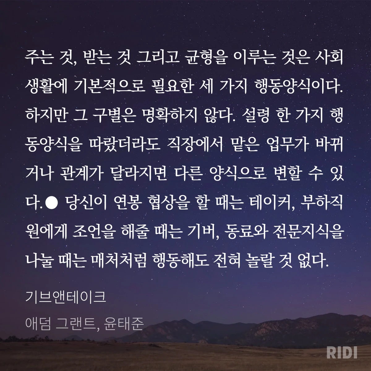 살다보면 호구잡혀서 사는 것처럼 느껴질때가 있다. 어떤 친구는 친구가 아니라 나를 이용만 해 먹는 기회주의자이다. 그럼 어떻게 관계를 맺어야 할까? 이런 고민에 대해서 애덤 그랜트의 인사이트가 빛나는 책이 있다. 애덤 그랜트의 '기브 앤 테이크(Give and Take)'는 사람들이 직장과 사회에서 타인과 상호작용하는 방식을 호혜의 원칙(Reciprocity styles)에 따라 세 가지 유형, 즉 기버(Giver), 테이커(Taker), 그리고 매처(Matcher)로 분류하고, 이들이 개인의 성공과 조직 문화에 미치는 심층적인 영향을 과학적으로 분석하고 있다.