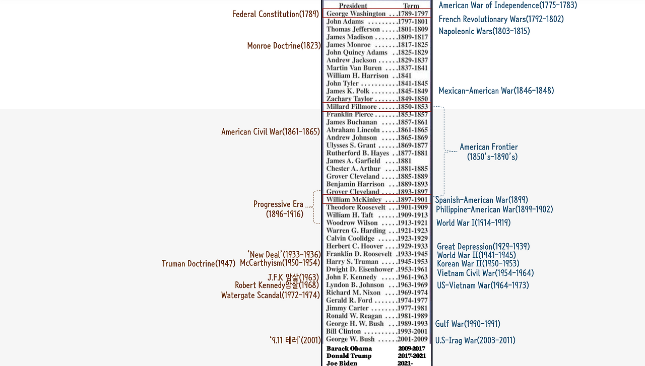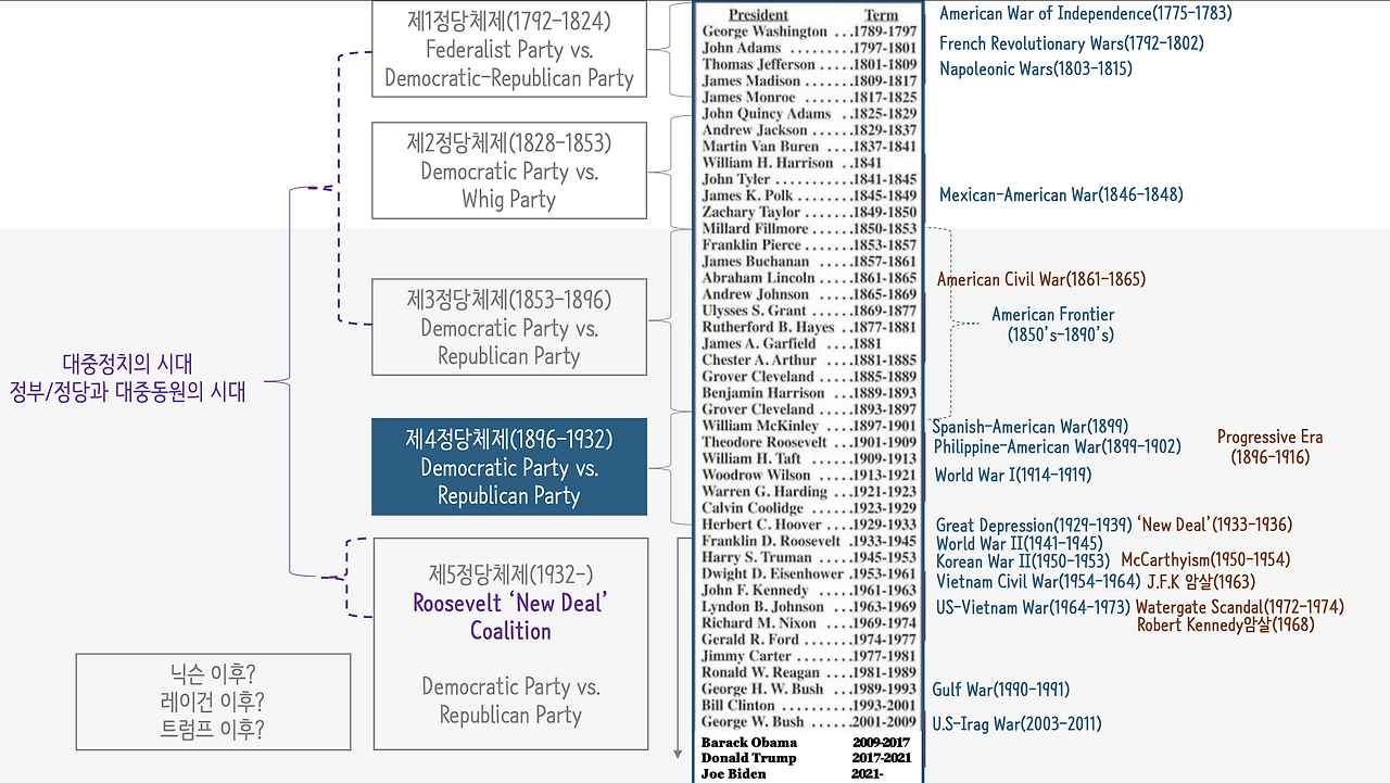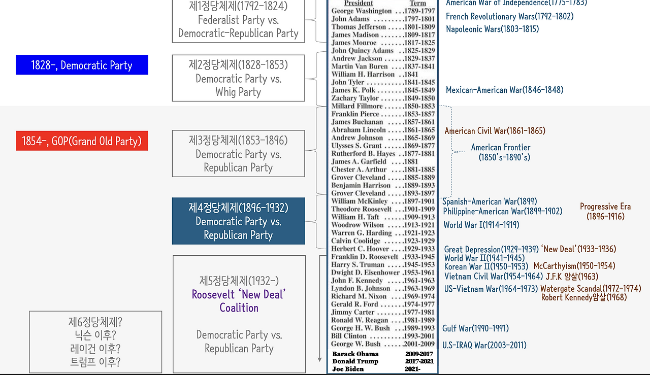 1828년부터 미국의 정치사를 바라보면 조지워싱터에서 시작해서 조지부시까지 총 5번의 체제로 구분해볼 수 있다. 미국정치는 시민들의 참여를 허용하느냐 아니냐에 따라서 체제구분을 새롭게 할 수 있었다. 첫번째는 민주당의 탄생이라는 의미에서 크게는 Democratic Party가 제 1정당체제에서 시작하였는데 상대당은 Federalist Party였다. 정당이 만들어지는 시기에 조지워싱턴이나 토마스제퍼슨과 같은 제헌헌법을 기초한 '파운딩 파더'들의 활동이 주가 되었다. 이 때는 미국이 어떤 방식으로 구성되어야하는지에 대한 '구획과 선거법, 조직운영'에 대한 방식의 논의가 주가 되었다.