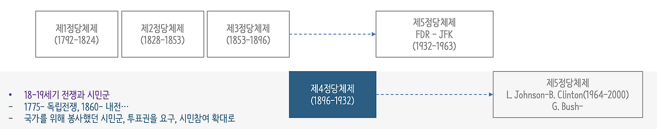 1828년 이후는 연방주의 논의를 넘어서 민주주의 자체에 대한 논의가 이어진다. 제 2정당체제라고 불리우는 시기에는 민주당과 휘그당의 싸움이 있었지만 대부분은 민주당의 승리로 이어졌고, 민주정당의 등장하게 된다. 민주정당이라는 것은 정당의 존재방식으로 볼 때 '대중정당'이 되면서 시민참여가 높아졌지만 제 4정당체제부터는 시민참여를 의도적으로 배제한 결과가 일어났다. 이 책의 핵심은 미국의 제 4정당체제인 1896년부터 1932년까지 '프로그레시브 시대'에 집중하고 있다. 이 말은 정치엘리트들이 더 이상 시민들의 참여가 필요하지 방법으로 제도 전환을 끝냈다는 것을 의미한다. 가만히 생각해보면 이 시기 이후에 미국의 시민들은 더 이상 정치주체로 성장하지 못하고 항상 표상되는 대표들에게 주인의 자리를 빼앗겨 왔다.