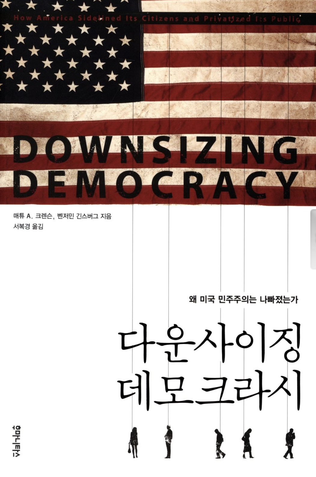 이 책은 미국 민주주의에 대한 인상적인 비판서이자, 민주화 이후 한국 민주주의가 왜 나빠졌는가를 비춰 주는 거울 같은 책이다. 혹자는 이 책을 “(미국판) 민주화 이후의 민주주의”라고 말한다. 주어를 미국에서 한국으로 바꾸어도 이상하지 않을 정도이다. 크렌슨과 긴스버그는 미국 민주주의가 나빠진 이유로, 정부 혹은 정치엘리트들이 더 이상 평범한 사람들의 능동적이고 집단적인 지지에 의존하지 않고도 권력을 유지하며 행사하고 자신들이 원하는 것을 얻을 수 있는 방법을 발견했다고 주장한다. 대중이 정치에 무관심해진 것이 아니라 더 이상 정치 엘리트들이 그들을 필요로 하지 않는 것이 문제라는 것이다. 혁신, 새로운 정치 혹은 개혁이라는 이름으로 이루어진 이 같은 변화는 정치를 집단으로서의 대중이 아니라 정치에 접근할 수 있는 의지와 지식과 능력을 가진 개인들의 영역으로 만들어 버렸다. 필자들은 이를 ‘개인민주주의’라고 부른다.