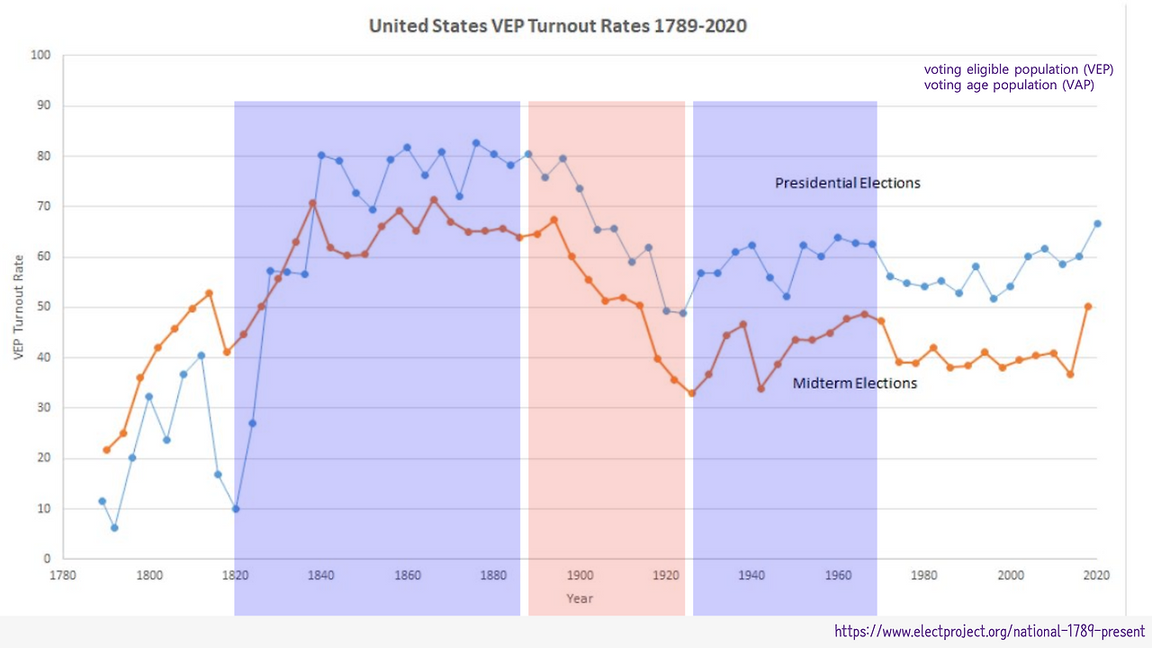 그런데 이것도 조금은 웃긴 일이다. 민주당은 '우리가 졌어! 그런데 너무 창피하다. 우리가 지다니, 우리가 엘리트인데 저런 포퓰리즘주의자들에게 지다니'이러고 있다. 그것은 엘리트인 자신들의 자존심을 꺽었다는 의미에서 슬픈것이지, 사실 시민들은 그다지 변화를 못 느끼게 된다. 물론 여기에서 역량의 문제는 논외로 한다. 민주주의에서 시민을 몰아낸 결과 남은 건 엘리트주의와 포퓰리즘밖에 없다. 아래 그림에서 보는 것처럼 1880년 이후가 되면 급속하게 투표율이 떨어지는데, 이것은 프로그레스 시대의 '진보의 시대'가 아니라 혁신의 시대에 시민들을 몰아낸 결과였다. 그 대신 정치인들은 자신들의 왕국을 이룩했다.