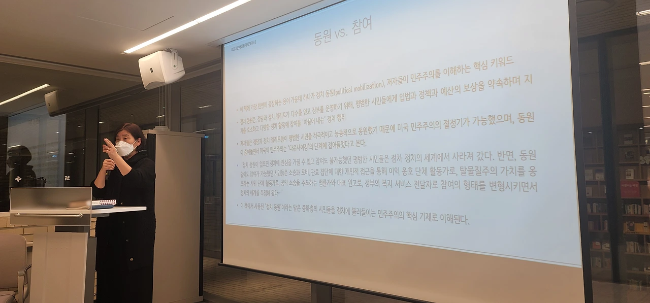 "오에이치피OHP 필름 두 장을 겹치듯이 이 두 가지 현상을 겹쳐 놓아 보면, 한국 민주주의의 또 다른 모습이 보인다. 정당과 정치 엘리트의 정치 동원은 터부시되고 법과 제도가 이를 뒷받침하며 점점 더 동원을 제약해 온 상황에서, ‘행동하는 양심’과 ‘깨어 있는 시민’만이 정치의 공간을 독점할 때, 그 이면에 동원되지 않으면 참여조차 불가능한 시민들의 모습은 점점 보이지 않게 될 것이다. 개인으로서도 정치에 참여할 능력을 가진 일부 시민들은 여전히 정당의 중요한 동원 대상이며, 정치의 공간에 자기 자리를 가진다. 반면 정당도 동원을 포기했고 혼자서는 ‘자발적 참여’를 할 수 있는 조건이나 능력이 없는 시민들은 점점 더 정치의 변방으로 밀려나고 있다.