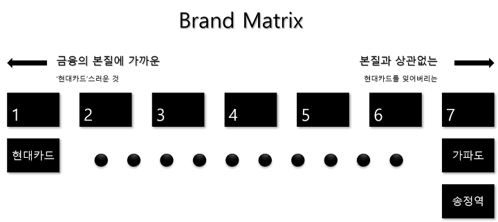 브랜딩에 진심이라면 현대카드 정태영 사장의 강의를 들어보자. 아주 브랜딩과 핵심가치, 브랜딩 아키텍쳐와 브랜딩 매트릭스가 잘 정리되어 있다. 이러한 브랜딩 경영으로 현대카드는 업계 2위로 성장하고 있다.