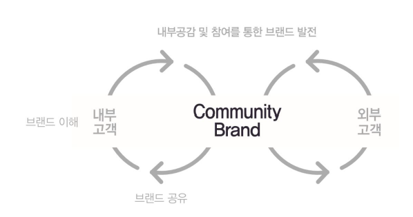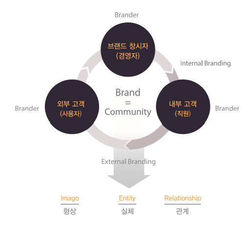 브래드를 커뮤니티라는 개념으로 확장하게 되면 브랜드 창시자인 경영자와 이것을 사용하는 외부고객 뿐만 아니라 고객의 가치를 브랜드로 창조해내는 내부고객인 직원까지 포함하게 된다.