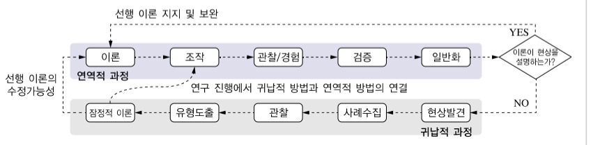 이론이 분석할 현상을 모두 포괄하면서도 이 현상 자체를 설명할 수 있는지를 확인해보는 것이다. 그렇다면 이론은 무엇인가? 이것을 알기 위해서는 이론이 만들어지는 과정에 대한 학습이 필요하다. 이론을 이루는 기본적인 것은 '정보'이다. 정보를 이루는 기본적인 단위는 '데이타'이다. 그러니깐 데이타들의 '연결'관계가 '정보'가 되고, 정보들이 일정한 '패턴'으로 계속 똑같은 경로를 보일 때 이것을 지식이라고 부른다. 연구를 한다는 것은 이러한 지식을 발견해 내는 것이다. 아래로부터는 '정보'를 가지고 조합을 한다면, 위로부터는 어떤 것을 가지고 올까? 그것은 바로 '원칙'인 '이론'이다. 이론은 일정한 지식들이 그러한 패턴을 가지게 되었는지를 현실에서 대입해 보고 확인한 결과이다. 그러니깐 지식은 책상 위에서 만들어지지만 이론은 지식이 책상을 떠나서 현실에서도 적용되는지를 보는 것이다. 적용되었기 때문에 지금 우리가 믿고 있는 이론은 여전히 이론이 된다.