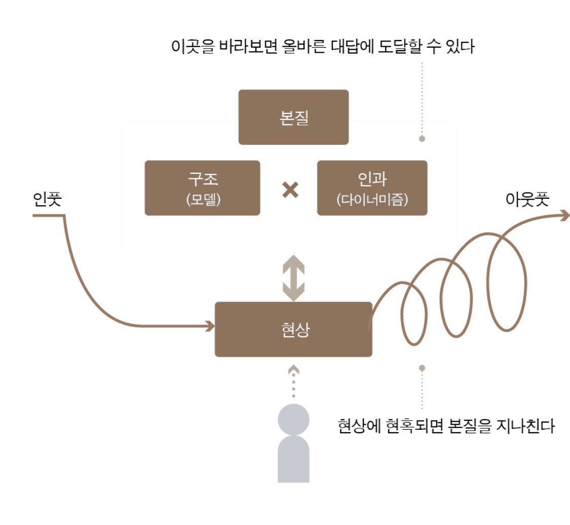 위의 그림은 '일등의 통찰'이라는 책에서 가져온 것이다. 이 책의 원래 이름은 '본질통찰'이다. 본질은 구조와 인과로 되어 있고 현상은 이러한 본질이 상황을 만나서 생기는 것이다. 지금 이야기하고 있는 논조로 이야기한다면 구조는 모델이자 이론이고, 현상은 방법론이다. 인과는 바로 구조와 현상이 어떤 방식으로 연결되는지를 그려보는 작업이다. 방법론은 바로 이 연결을 찾아내는 작업이다. 그러니깐 현상의 다양한 데이터가 서로 어떤 변수관계로 연결되어 있는지를 밝히고 이것이 배경으로 하고 있는 이론의 바운더리를 넘어가는지 아닌지를 파악하는 것이다. 그러니 현상의 다양한 데이터를 추출하는 방법과 이것들의 변수관계를 찾아내는 과정에서 방법론이 적절하고 확실한지를 따져 묻는 것은 중요한 부분이다.