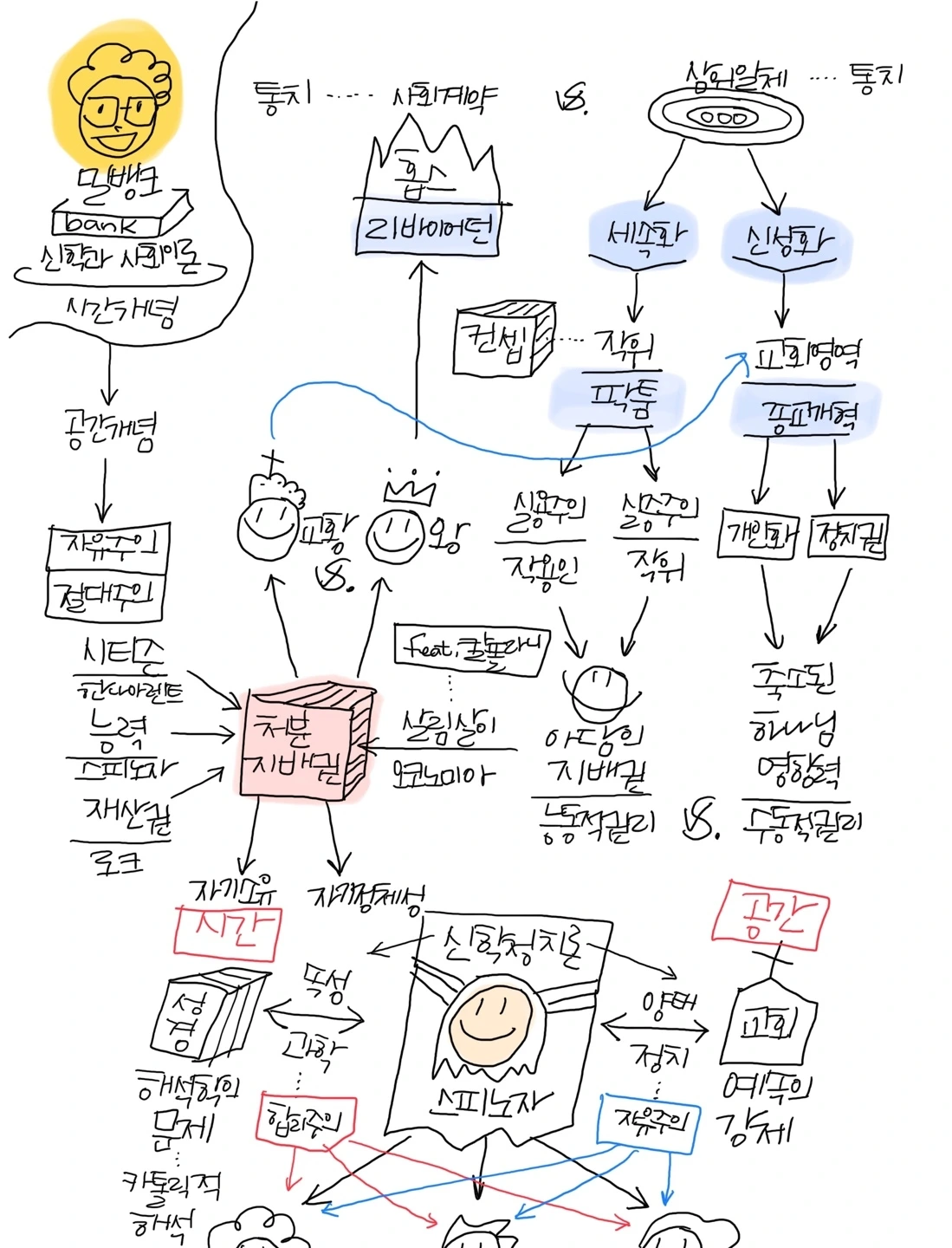 문제는 이러한 역사를 모르는 상태에서 대부분의 기독교인들, 특히 한국 보수 기독교는 '신성화'에 집중하면서 세속화를 악마시했다. 그것은 결국 세속영역이라고 부르는 영역에서 하나님이 존재하지 않으며, 그 곳에 살아가는 사람들까지도 악마시했다. 그러니 마녀사냥은 지금도 여전히 행해지고 있는 것이다. 탈신성화영역에서 그럼 어떤 일이 이어질까? 당연히 흔적으로 남아 있던 신성화의 파편들을 몰아내는 작업들을 하게 된다. 특히 이신론의 선구자였던 스피노자의 경우에는 '신학정치론'에서 탈신성화된 정치의 영역에서 완전히 신성화를 벗겨내는 작업을 하게 된다. 말그대로 교회의 '예속'에서 벗어나는 것이 핵심이었던 것이다. 하나님이라는 '신'을 레퍼런스로 잡지 않고 생각할 수 있을려면 어떻게 해야할까? 이것이 스피노자의 고민이자 데카르트의 고민이었다.