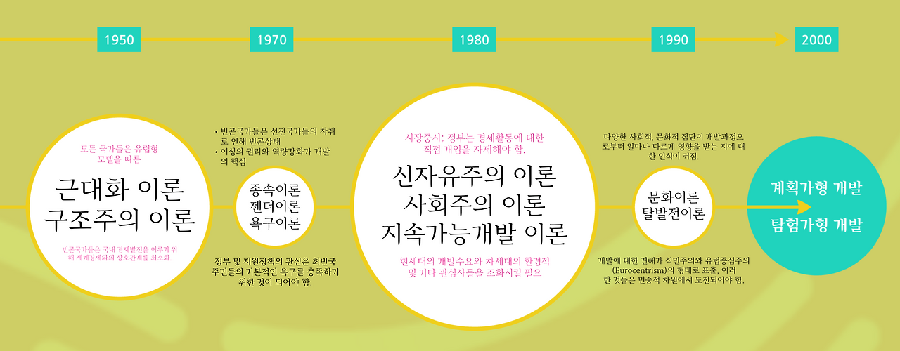 - 발전경제학의 측면에서 1950년대부터 2000년대까지 이론적인 흐름은 아래와 같다. 근대화이론에서 시작해서 종속이론과 젠더이론을 거쳐서 1970년대가 되면 인간의 기본적인 욕구에 집중하게 된다. 1980년대에는 비로소 신자유주의 이론이 등장하면서 캐리가 말하는대로 전세계가 거대한 경쟁장이 된다.