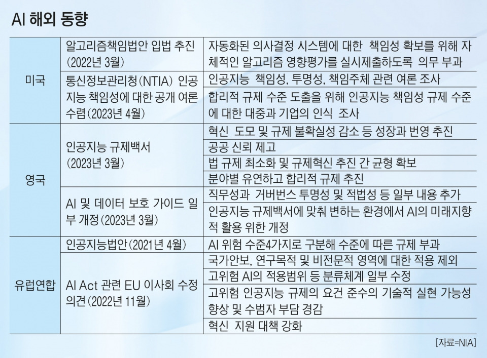 인공지능에 관한 법제는 생성형AI가 도입되기 전부터 논의가 되어 왔다. 인공지능을 사용하는데 있어서 윤리적인 원칙을 확보하고 인간이 뒤쳐지는 미래를 만들지 않기 위해서 법안들이 서둘러서 마련되어야 한다. 미국과 영국 그리고 유럽연합과 한국의 경우에는 조금씩 다른 법안의 방향들이 보인다.