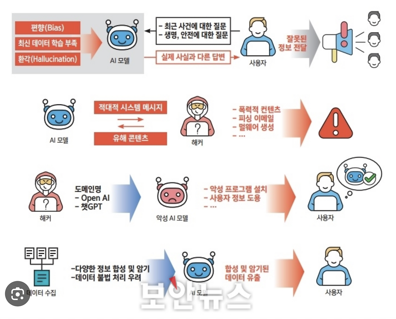 경쟁이슈와 함께 보안이슈도 발생한다. 공격자의 측면에서 보면 ChatGPT를 활용하여 악성도구를 개발하면 다른 시스템을 공격하 할 수 있다. 보통 우리가 알고 있는 악성코드인 랜섬웨어를 계속해서 생성할 수 있게 되면서 웹페이지를 공격하고 취약한 지점을 찾도록 분석하여 공격스크립트를 생성할 수도 있다. 또한 피싱메일의 증가와 함께 메일을 쉽게 맞겅하고 수정이 가능해지면서 해외공격자들은 쉽게 스팸메일을 무한대로 생성해낼 수도 있다. 이용자의 측면에서는 개인정보와 기밀 유출우려로 ChatGPT를 사용하지 못하게 하는 사례가 늘고 있다. 모델 공격의 측면에서는 악의적 학습데이터 주입을 통해서 결과물에 영향을 주는 데이터 오염공격도 일어날 수 있다.