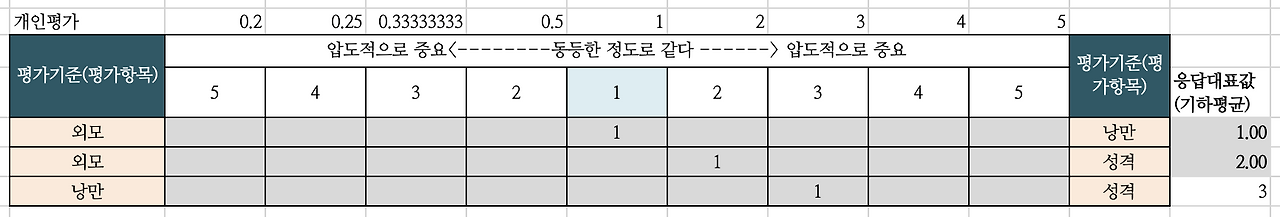 예를 들어, 개인적인 변수이지만 배우자를 선택하는데 있어서 외모, 낭만, 성격을 중에서 어떤 것이 중요한지를 가중치를 매겨본다고 해보자. 그러면 각각 몇 퍼센터정도인지를 계산하는 것이 주관적으로 어림짐작이지만 사실 명확하지 않아서 자신도 믿지 못한다. 그런데 아래와 같이 계산식에도 넣어 보면 가중치가 계산되는 놀라운 일이 발생한다. 아래와 같이 외모와 낭만, 외모와 성격, 낭만과 성격을 가지고 쌍대비교를 해보면 아래와 같이 된다. 평가기준간의 구간을 5에서 1까지, 다시 1에서 5까지로 놓고 구간별로 평가값을 부여한다. 왼쪽 5점에 가까우면 0.2 그리고 오른쪽 5점에 가까우면 그대로 5점이 된다. 그러면 자신이 원하는 지점에서 1~3행을 평가한다. 그러면 아래와 같이 된다.