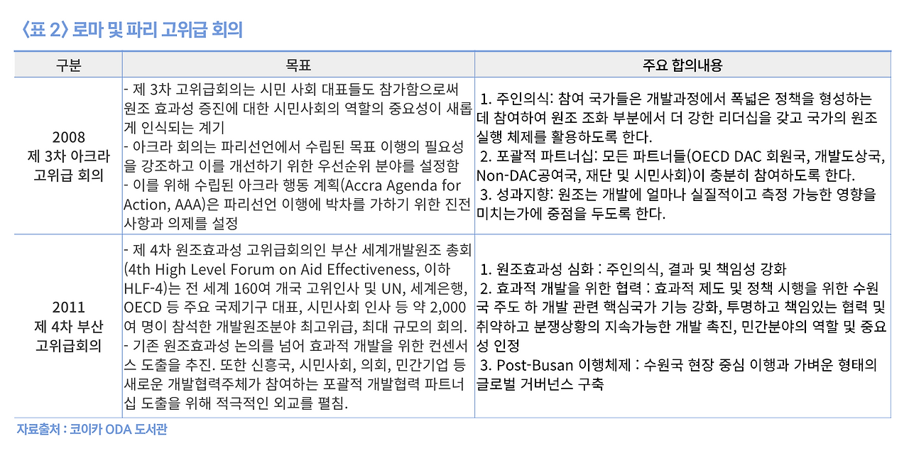 그러나 2005년 프랑스 파리에서 진행된 제 2차 파리 고위급 회담에서는 공여국과 수원국의 상호책임성을 기반으로 수원국의 주인의식을 제공하고 공여국과 수원국의 목표를 일치시키려는 노력 등 '개발효과성'에 대한 담론이 시작되었다고 볼 수 있다. 원조효과성이 원조를 하는 공여국의 기준에서 사업의 타당성과 합리성을 개선하는 작업이라면 개발효과성의 담론은 개발을 실제로 진행하는 수원국에서 개발이 효과적으로 이루어지기 위한 방법이었다. 따라서 수원국의 필요와 상황에 맞게 목표를 설정하고 개발성과에 초점을 맞추는 것이 주요한 합의 내용이었다. 2005년 파리 고위급 회의 이후 진행되는 회의는 파리회의에서 주창된 '파리선언'의 보충의 성격이 강하다고 볼 수 있다.