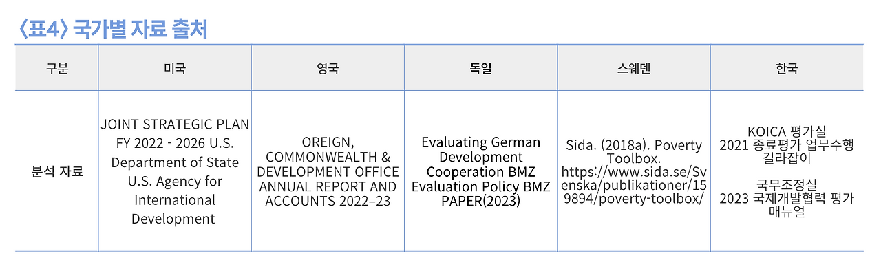 주요한 자료의 출처는 다음과 같다. 미국의 경우 국무성과 국제개발처가 공동으로 발행한 2022~2026 전략문서를 참조했으며, 영국의 경우국제개발부의 2022~2023 연례보소서 내의 전략 및 프레임워크를 참조하였다. 독일의 경우에는 다양한 부서 중에서 독일 연방경제협력 평가연구부(BMZ)의 평가기준 문서를 참조했다. 스웨덴의 경우 국제개발협력기관 SIDA의 자료를 참고하고 한국의 경우 KOICA 평가실에서 발행한 종료평가시 업무수행 길라잡이와 국무조정실의 2023년 국제개발협력 평가 메뉴얼을 참고하였다. 기존의 연구들은 조직과 시스템에 대한 분석을 진행하였다면, 본 연구에서는 실제 평가문서에서 제시하는 프레임워크 혹은 전략, 지침, 원리들을 비교 분석하였다.