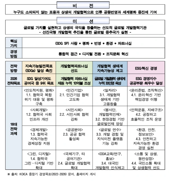 한국은 국제개발협력에 있어서 한국국제교류협력단인 KOICA는 2022-2026년까지 "누구도 소외되지 않는 포용과 상생의 개밣벼력으로 인류 공동번영과 세계평화 증진에 기여"한다는 비전을 제시하고 있다. 이러한 비전을 이루기 위한 미션으로 글로벌 가치를 실현하고 상생의 국익을 창출하는 선도적 글로벌 개발협력기관이 되기를 계획하고 있고 선진국형 개발협력 추진 글로벌 중추국가 실현을 최종 목표로 하고 있다. 이를 위해 2026년까지 전략목표로써 지속가능발전 목표에서 달성기여도 공여국 중 9위를 목표로 하고 있으며 개발협력 파트너십의 재원누적 10억불 조성 및 글로벌 개발협력 생태계를 만들기 위한 고용창출과 그로벌 인재 양성에 집중할 예정이다. 또한 최근 중요한 이슈로 부각한 ESG혁신 경영과 관련하여 공정하고 윤리적인 조직혁신을 달성하기 위한 노력을 볼 수 있다.