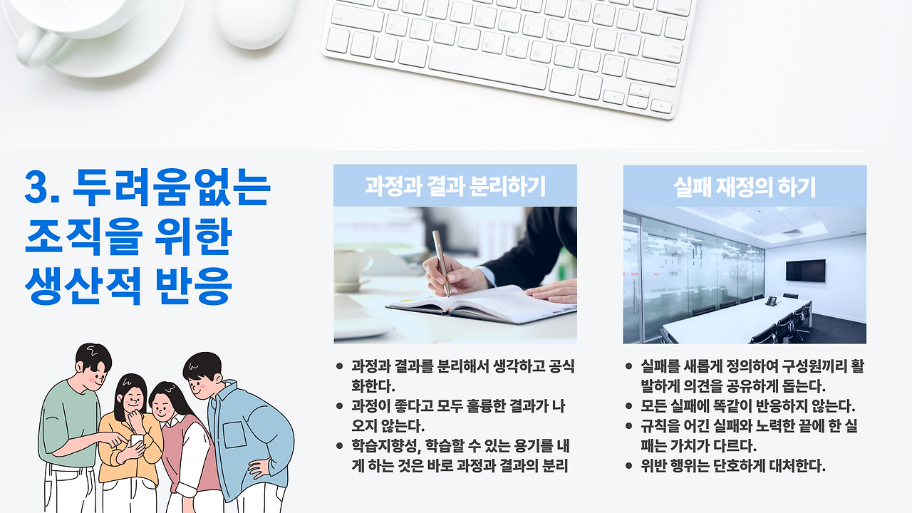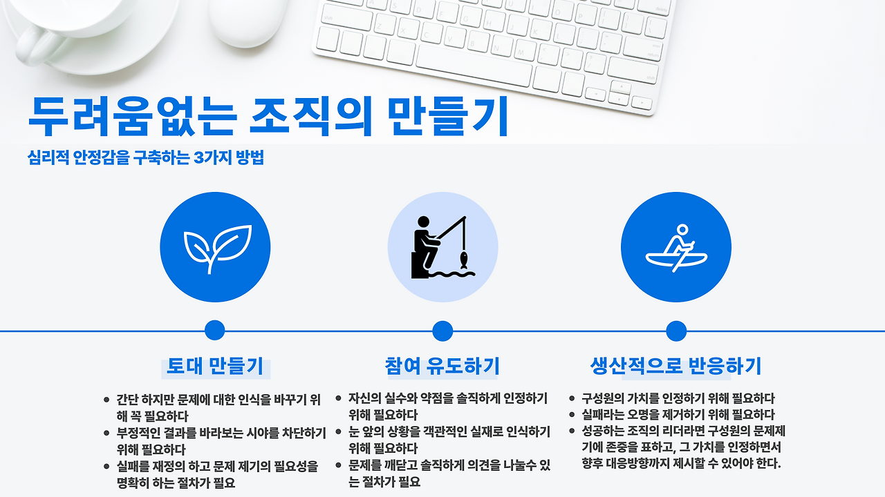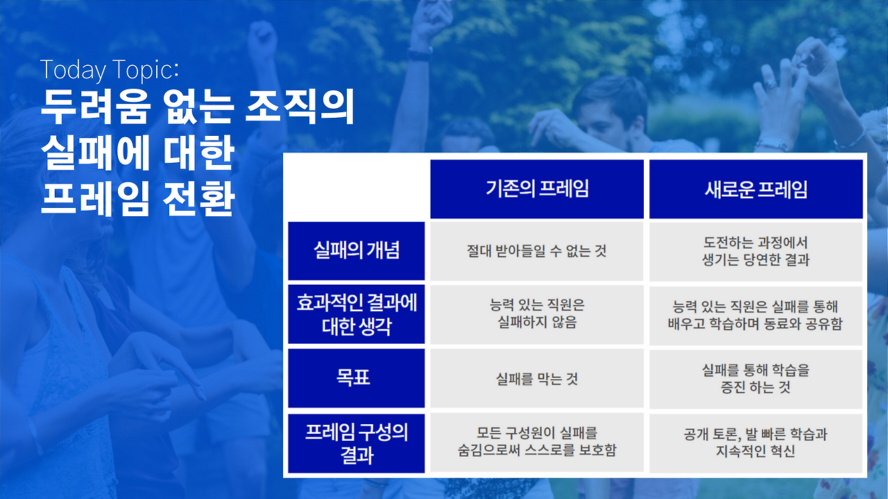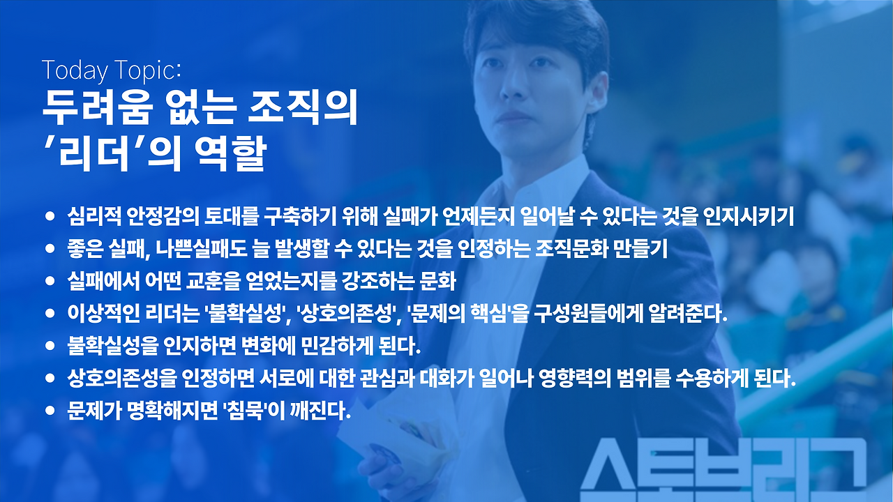 왜 이렇게 되었을까? '예! 알겠습니다!'라고 외치는 예스맨들이 넘치는 조직은 혁신이 사라질 수 밖에 없다. 새로운 것을 도전할 수 없는 조직문화가 반드시 '좋은 질문'이 있어야만 이루를 수 있는 혁신을 사전부터 막아 버리기 때문이다. 최근에 가장 많은 감명을 받은 두려운 없는 조직을 리뷰한다. 아무리 생각해도 두려움 없는 조직을 만드는 것이 핵심이다. 두려움있는 조직을 만들어가는 것이 보통이지만 두려움 없는 조직을 만들 때 뿌리깊은 혁신과 풍부한 피드백을 통해 조직원들이 건강해질 수 있다. 새로움을 품은 미래를 만들기 위해서는 두려움이 없는 조직을 만들어야 한다. 최근에 두려움 없는 조직으로 리더십 강의를 부탁받아서 강의안을 만들어 보았다. 두려움 없는 조직은 이제는 선택이 아니라 필수이다.