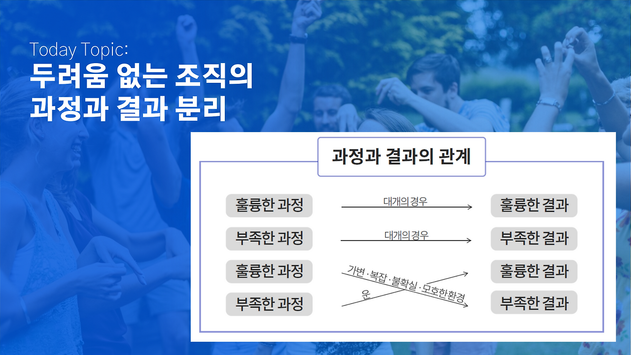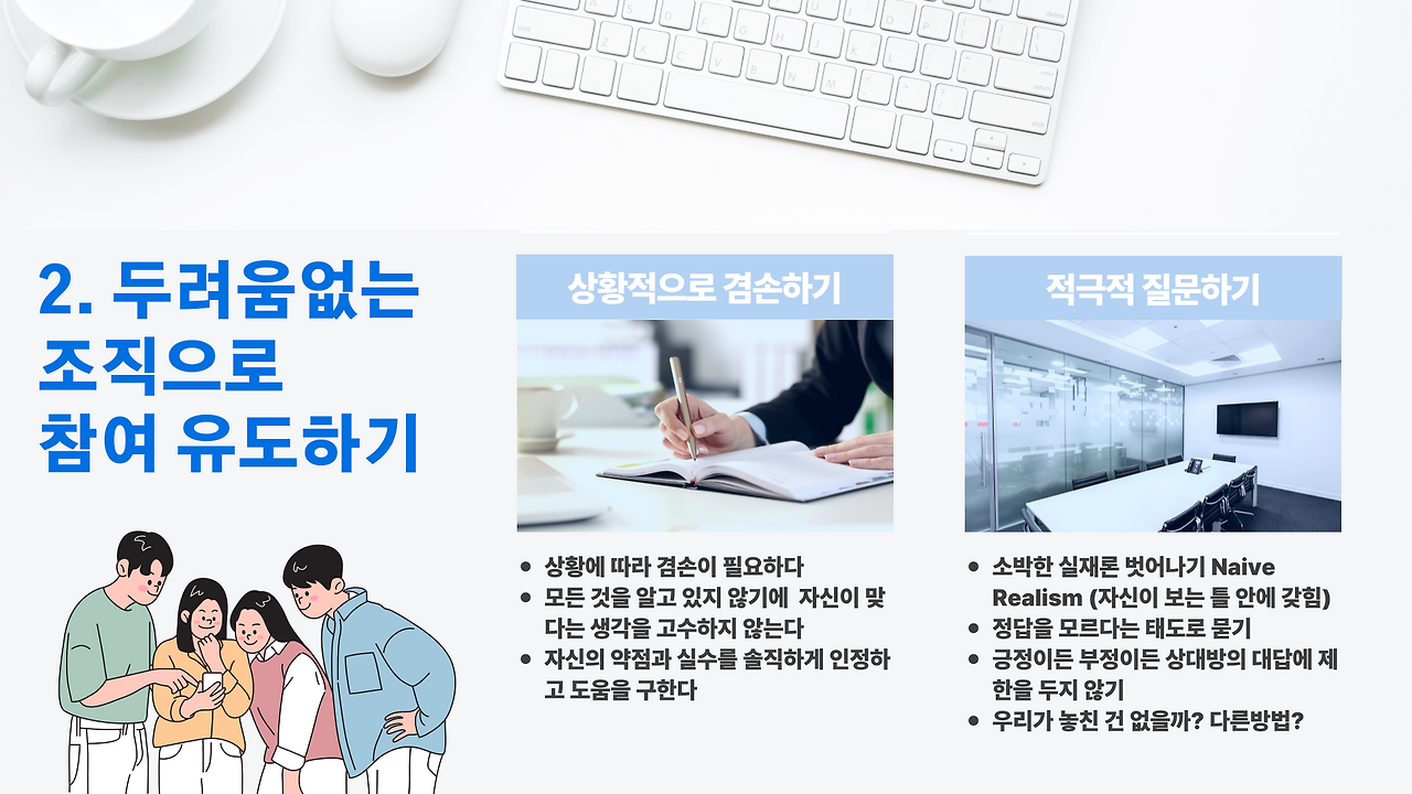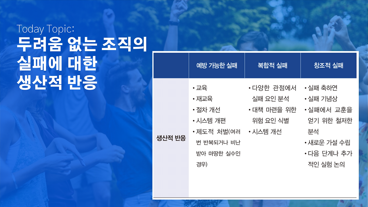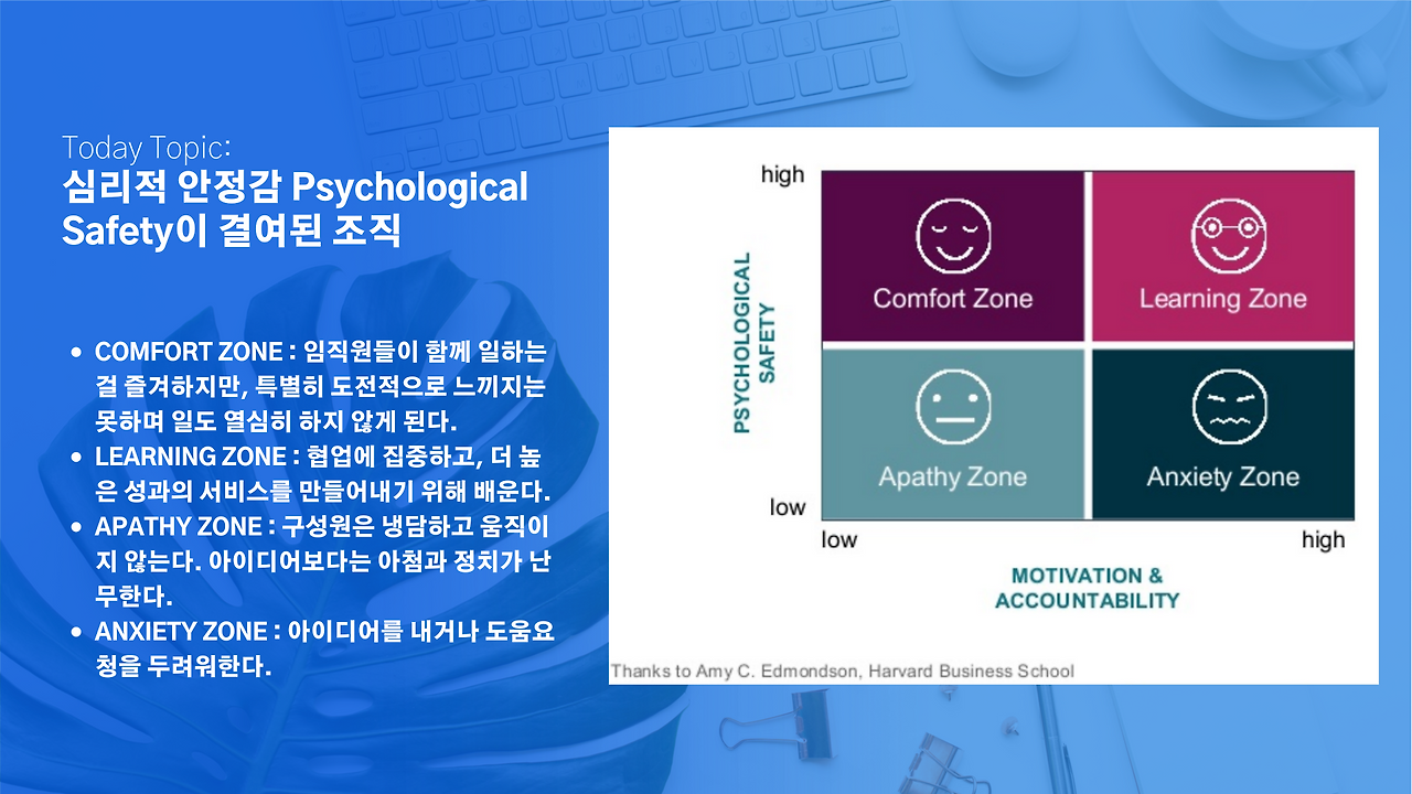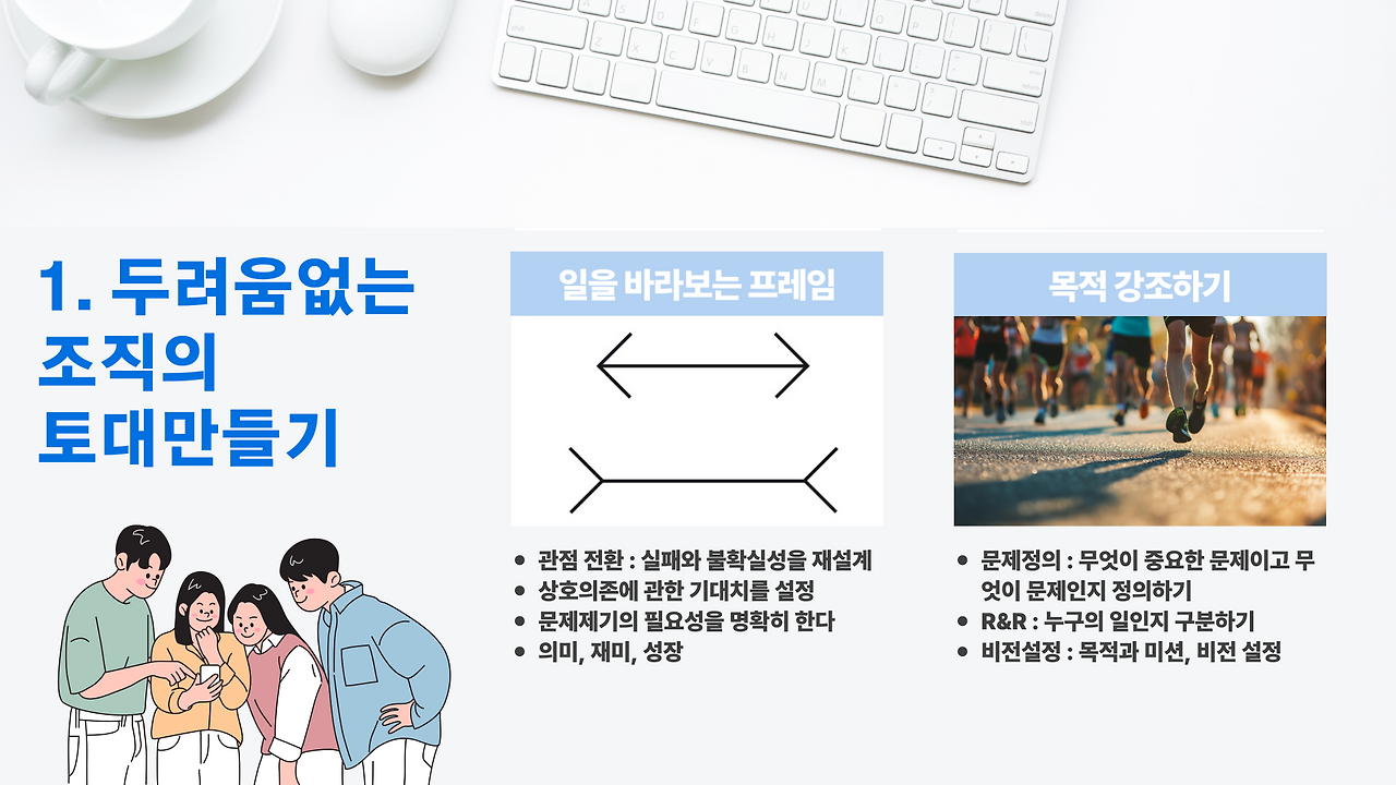 왜 이렇게 되었을까? '예! 알겠습니다!'라고 외치는 예스맨들이 넘치는 조직은 혁신이 사라질 수 밖에 없다. 새로운 것을 도전할 수 없는 조직문화가 반드시 '좋은 질문'이 있어야만 이루를 수 있는 혁신을 사전부터 막아 버리기 때문이다. 최근에 가장 많은 감명을 받은 두려운 없는 조직을 리뷰한다. 아무리 생각해도 두려움 없는 조직을 만드는 것이 핵심이다. 두려움있는 조직을 만들어가는 것이 보통이지만 두려움 없는 조직을 만들 때 뿌리깊은 혁신과 풍부한 피드백을 통해 조직원들이 건강해질 수 있다. 새로움을 품은 미래를 만들기 위해서는 두려움이 없는 조직을 만들어야 한다. 최근에 두려움 없는 조직으로 리더십 강의를 부탁받아서 강의안을 만들어 보았다. 두려움 없는 조직은 이제는 선택이 아니라 필수이다.