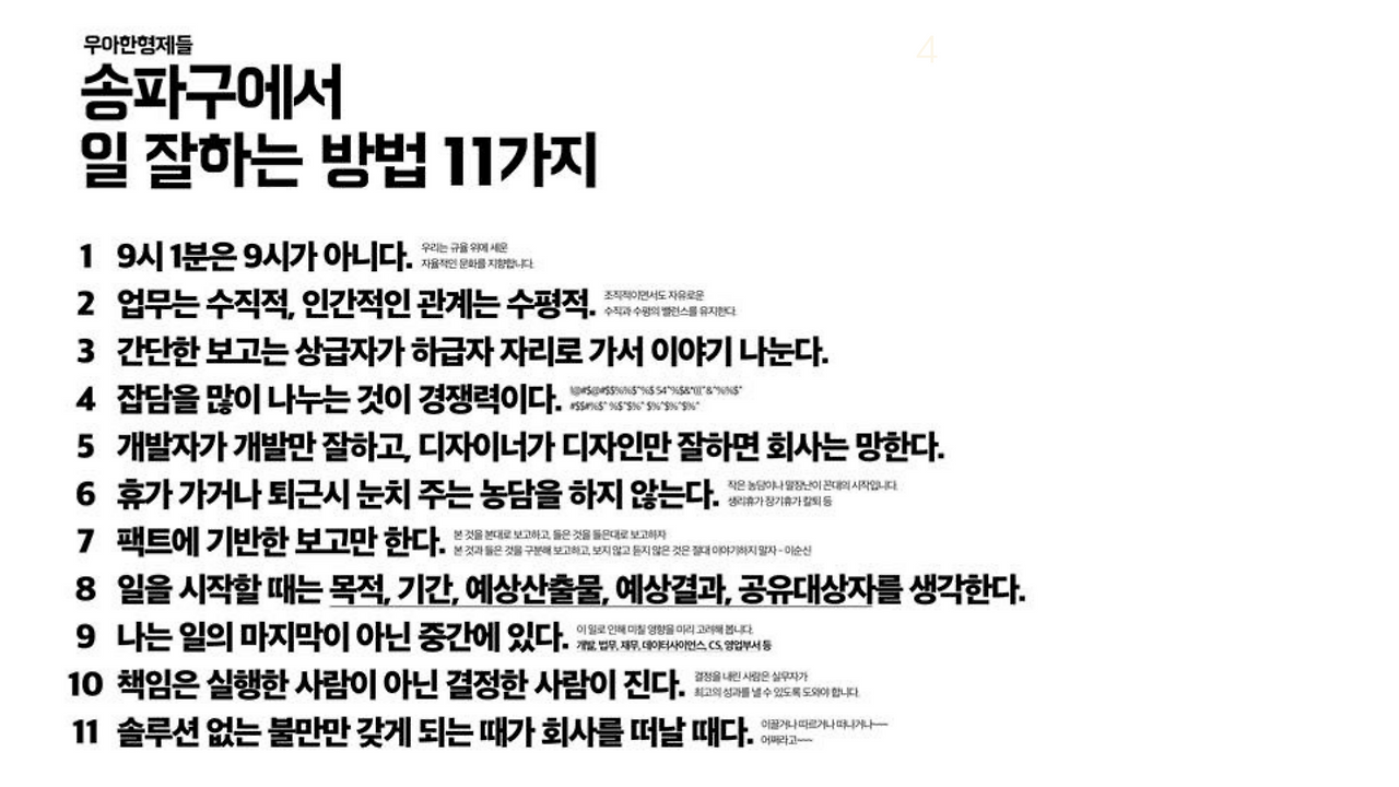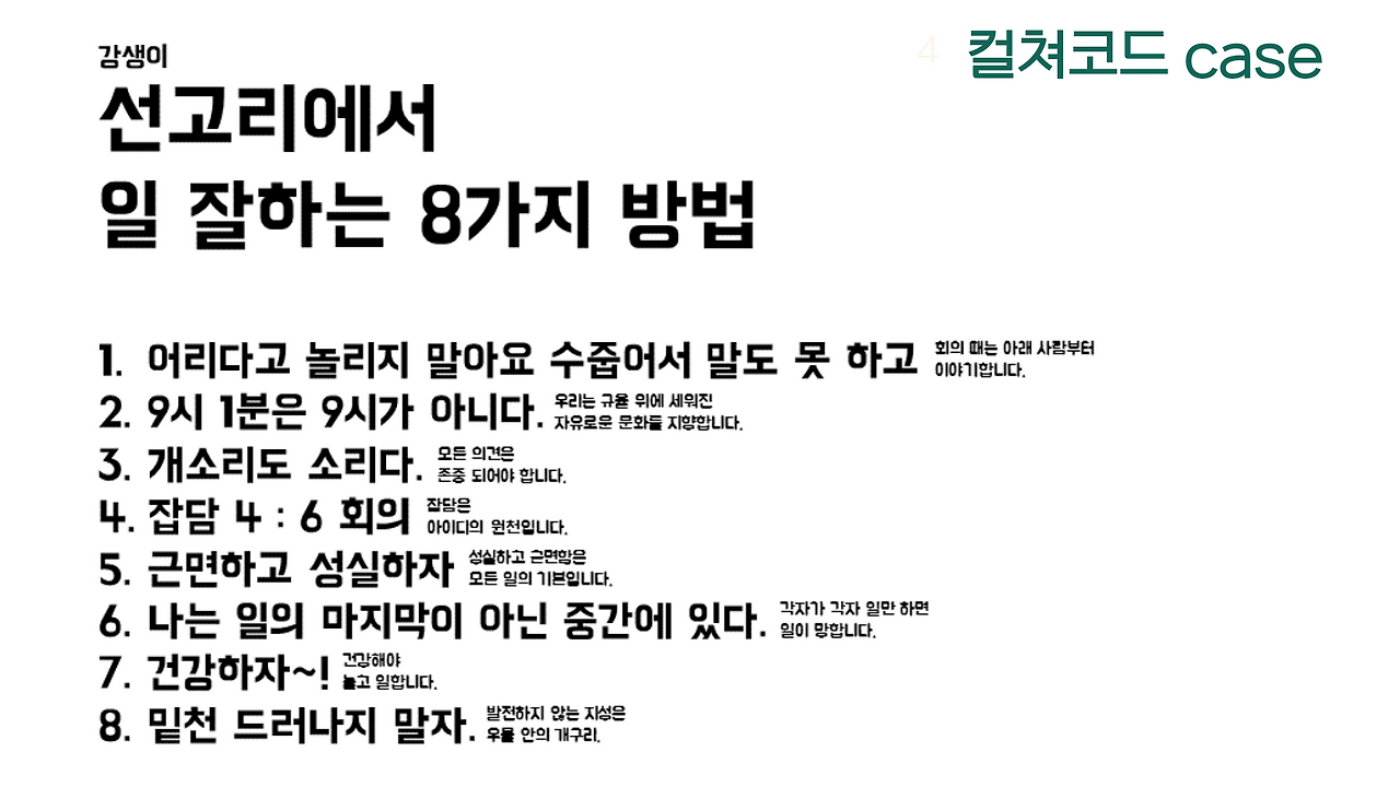 컬쳐 : 핵심가치를 정의하고 각 가치별 세부사항을 정리, 어떤 행동을 해야 하는지, 우리가 좋아하는 행위와 그렇지 않은 행위, 합의와 선포의 영역→ 친절히 풀어 설명하는 형태, 암묵적으로 공유하던 행동을 문장으로 다시 관찰하면서 메타인지를 할 수 있음, 행위를 언어로 설명→ ‘전파’에 용이함: 중학생도 이해할 수 있는 언어로 표현, 짧고 강렬한 선언문 형태를 추천함 예) 9시1분은 9시가 아니다: 위트와 직관성, 명료한 메시지까지 담은 문장