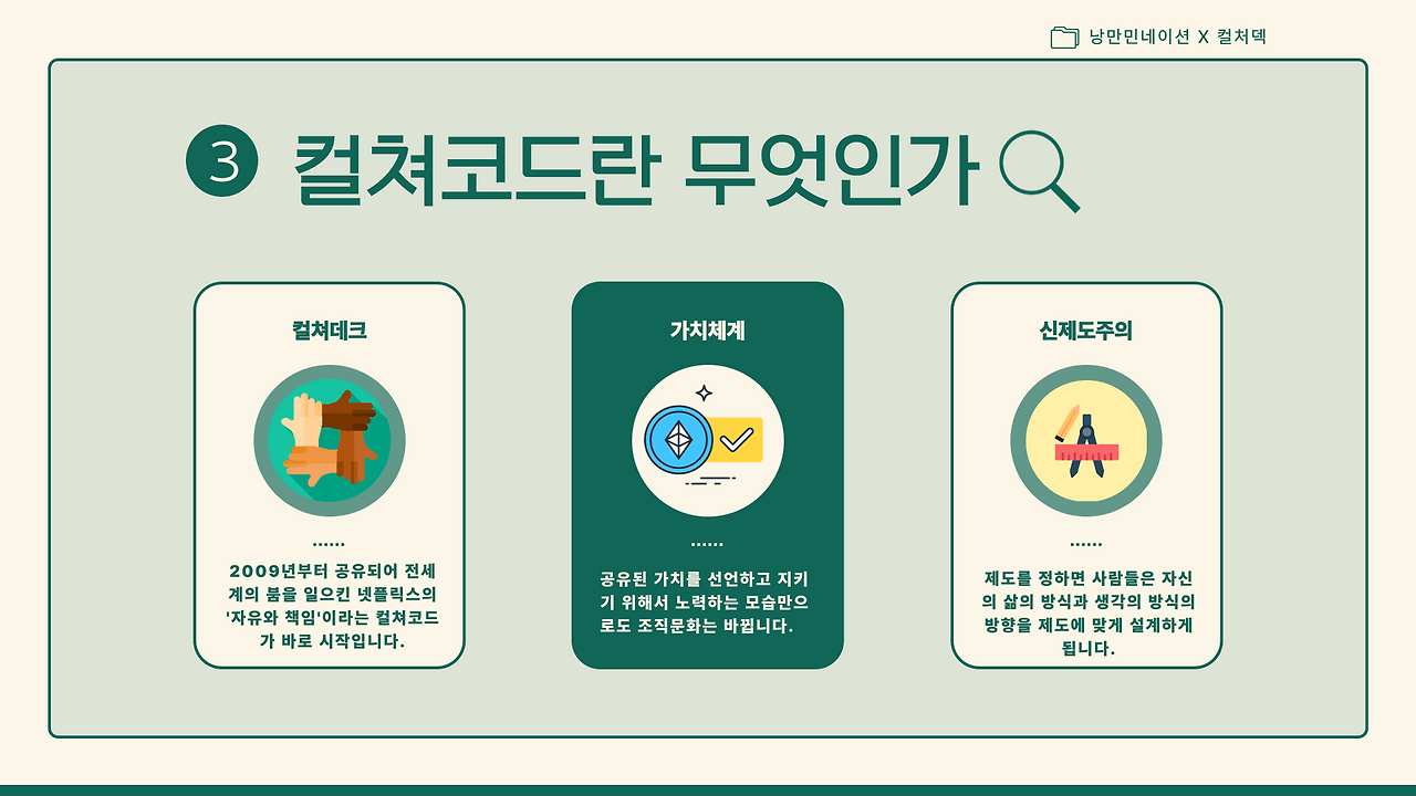 컬처덱은 기업의 생존과 성장을 위한 기업의 법전과 같은 것이다. 컬쳐덱이 유명해지기 시작한 것은 2011년부터 넷플릭스에서 매년 만들어 공유하는 '자유와 책임'이라는 컬처덱 때문이다. 알려진 것으로는 실리콘벨리에서 부터 전세계의 1500만명이 읽고 공감하고 공유하는 것이 바로 넷플릭스의 컬쳐덱이다. 컬처덱은 우리 조직이 어디로 향하고 있으며 어떤 문화를 가지고 있는지를 모아놓은 카드뉴스와도 같다. 컬처덱이 있는 조직과 없는 조직은 조직원들의 소위 말하는 '얼라인먼트'의 차이가 난다. 한 방향을 보고 같은 열정으로 마음을 담아 일하는 조직이 있는가하면 제 각각 따로 놀면서 대외적 메세지 관리도 안되고 브랜딩도 안되는 조직들이 있다. 스타트업에서 시작한 컬처덱에 대한 니즈는 현재는 모든 조직에고 공유되고 있다. 오늘은 컬처덱에 대한 간략한 정의와 컬처덱을 만들기 위한 미니워크샵인 '컬처코드' 워크샵에 대해서도 알아보자.