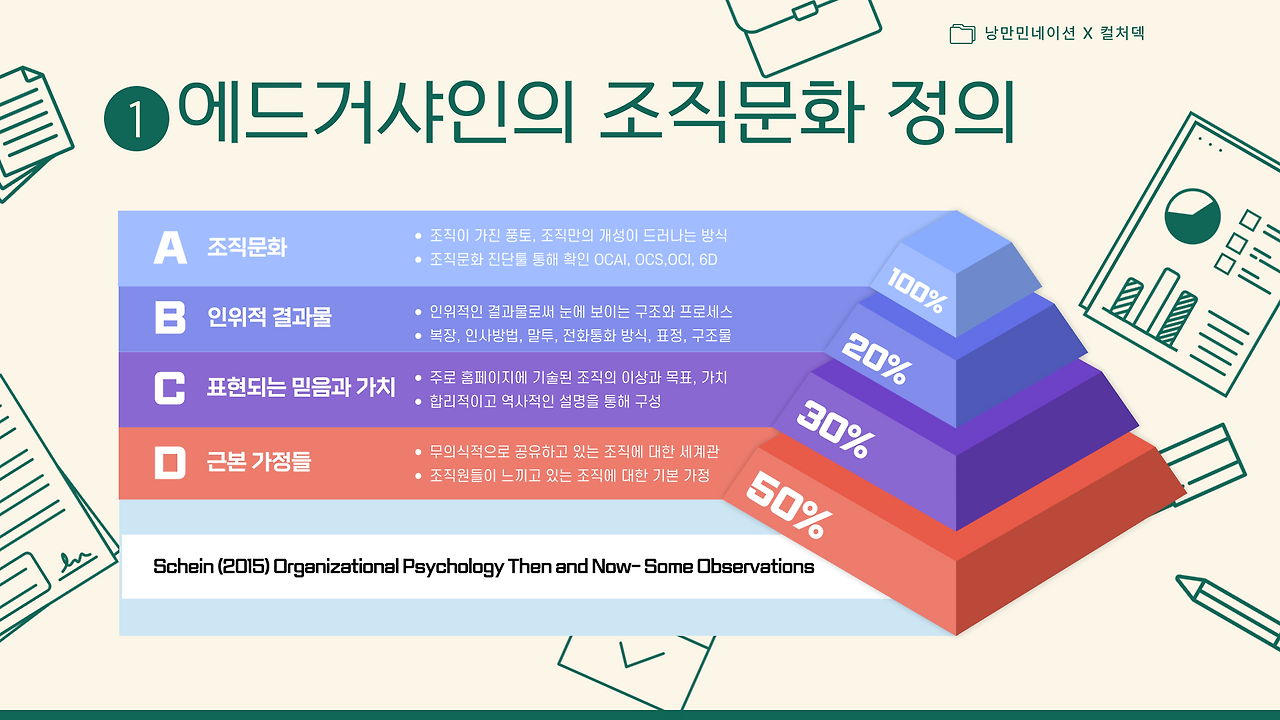 그래서 이러한 컬처덱에 대한 이해를 바탕으로 일하는 곳에서 컬처코드를 만드는 워크샵을 진행했다. 워크샵은 사람들이 서로 소통하고 자신의 생각을 다른 사람의 생각과 공유하면서 새로운 결과를 만들어내는 과정이다. 그래서 먼저는 조직문화에 대한 이해를 에드거샤인의 이론으로 설명했다. 사람들이 조금은 낯설어하긴했지만 에드거샤인이 분류한 인공물, 가치, 전제된 가정을 분류해보는 것만으로도 '문화'에 대한 이해가 높아졌다. 이어서 조직문화 4대 모델을 공유하고 자신들이 속한 문화가 어디에 속하는지를 알아보았다. 예정부터 '이론이 없는 경험은 공허하며, 경험이 없는 이론은 의미가 없다'라고 생각했기에 사람들이 이론적인 배경을 기반으로 자신들의 문화를 바라보기를 바랬다.