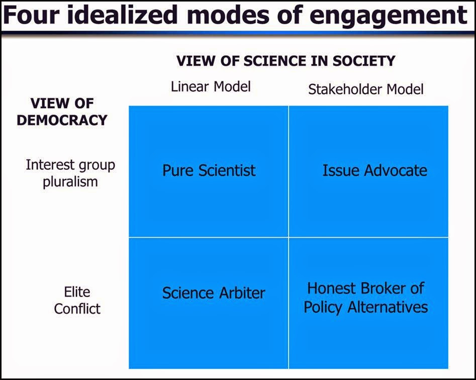 과학중재자는 전문가로서 어떤 사건이 발생하거나, 정책이 실행되면 어떤 요인이 발생하는지를 다양하게 보여준다. 퍼실리테이터라고 할 수 있다. A가 원인이 되어서 B가 되었다고 하는 식의 자료들을 보여주는 것이다. 과학중재자는 보통 중립적이라고 생각이 들지만, 어디에 있어도 이런 태도를 지니는 사람들을 말한다. 자신의 의견보다는 문제의 원인과 결과를 분석하는 정도에 그친다.