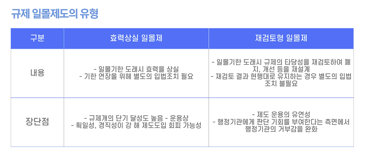 규제영역에 대한 일몰제 도입은 국민의 권리를 제한하거나 의무를 부과한 규제에 대하여 개별적으로 존속기한을 설정하고, 주기적으로 해당 규제의 타당성을 점검하여 규제의 유지 여부를 결정하고, 규제존속의 필요성을 입증하지 못할 경우 자동적으로 종결하는 것으로 근본적으로 규제실패를 방지하는데 의의가 있다.