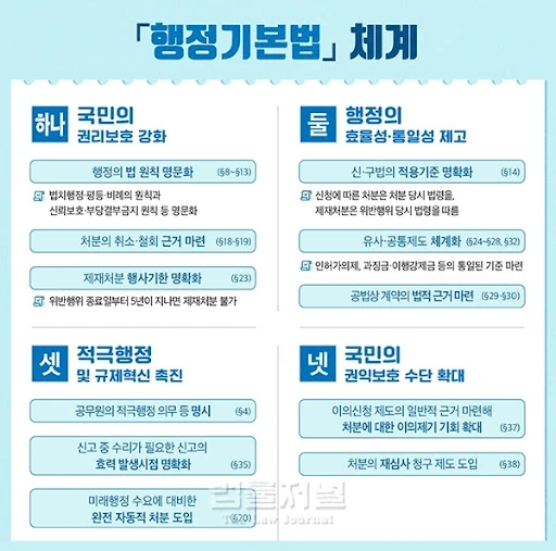 행정기본법은 그 동안 명문 규정 없이 학설과 판례로만 인정되어 온 행정의 법 원칙을 법률로 명확히 하기 위해서 발의되었다. 행정의 통일성과 적법성을 높이고, 쟁송을 통해 더 이상 처분을 다툴 수 없게 된 경우에도 행정기본법을 통해서 재심사를 받을 수 있도록 하여 국민의 권익보호 수단으로 확대하는 내용이 담겨 있다. 행정 법령은 그동안 국가 법령의 대부분을 차지하면서도 민사, 형사, 상사 분야와 달리 일정한 성문법이 없는 상태였다. 국가법령이 5,000여개 중에서 4,600건이 이상이나 행정 법령에 해당한다. 행정기본권이 시행되면, 실정법에 없는 행정법에 원친과 기준이 만들어지면서 일관된 집행이 가능하게 된다고 할 수 있다.