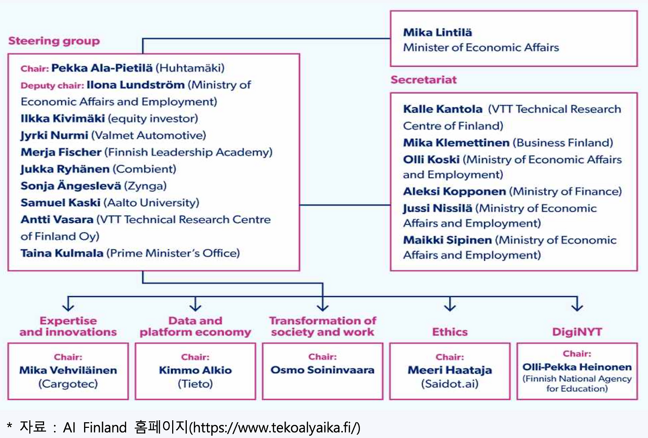 핀란드 전자정부의 거버넌스 구성은 다음과 같다. 총리실에서는 전반적인 디지털 전략을 설정하고 재무부에서는 경제적 측면에서 디지털서비스의 효율성과 효용성을 판단한다. 겡제 및 고용부에서는 산업정책과 연계하여 디지털화가 산업과 연관되는 부분을 확인하고 교통 및 통신부에서는 실제로 통신인프라나 교통인프라와 디지털혁신이 연결되는 부분을 고려하여 정책제언을 한다. 이러한 전자정부 구성을 통해서 핀란드 정부는 디지털 전환을 통해 공공 서비스의 효율성과 접근성을 높이고, 데이터 경제를 활성화하기 위해 지속적으로 노력하고 있다 (https://valtioneuvosto.fi/en/government). 또한 이러한 중앙정부의 거버넌스의 주축 아래서 공공기관과 연구기관 및 대학이 연결되어 있다.